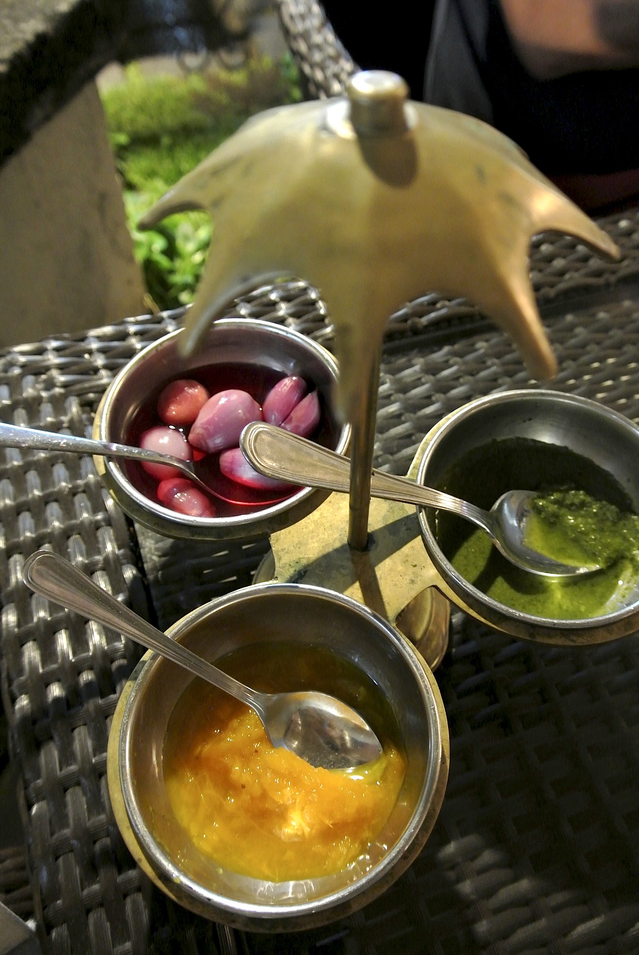 らっきょう?バワンメラ?みたいなものとマンゴーソース、ミントソースがあります。