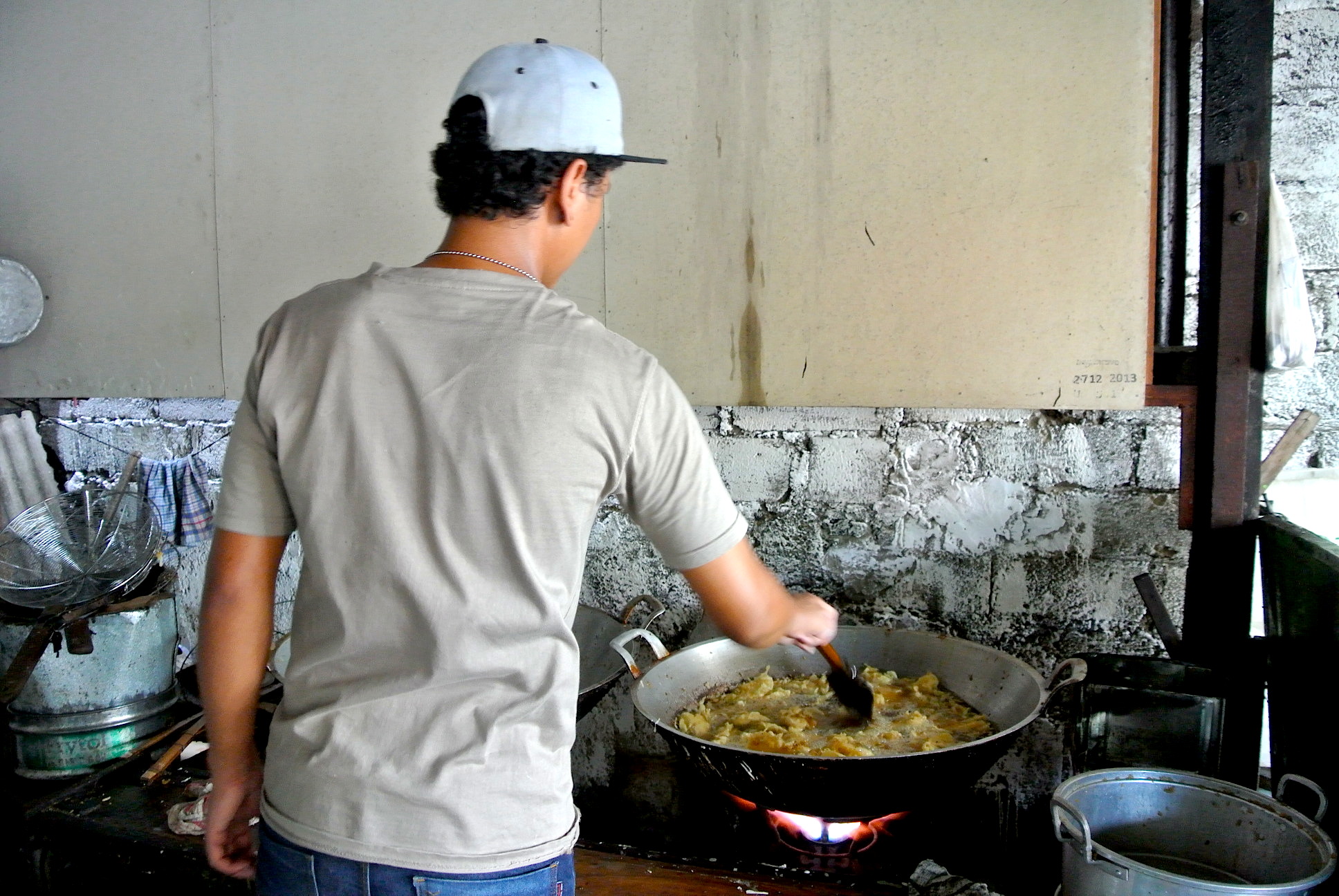 絵のコックさんが持ってるのは まったくピサンゴレンじゃないけど、ここトゥバンでは有名なんです。