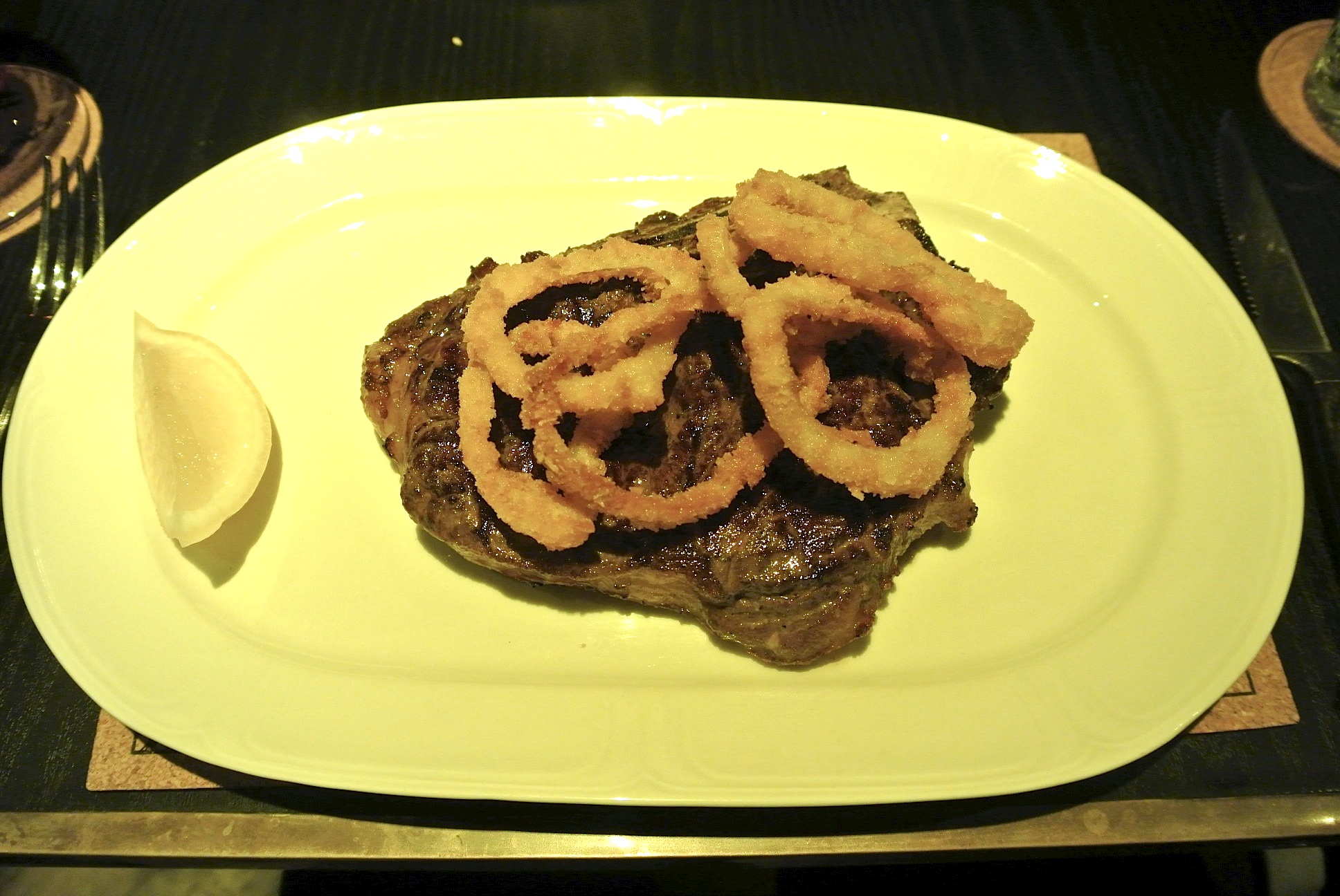 お肉の上にオニオンリングがドンッ。ヽ(‘A`)ノ 意外とシンプルな盛りつけです。(笑)