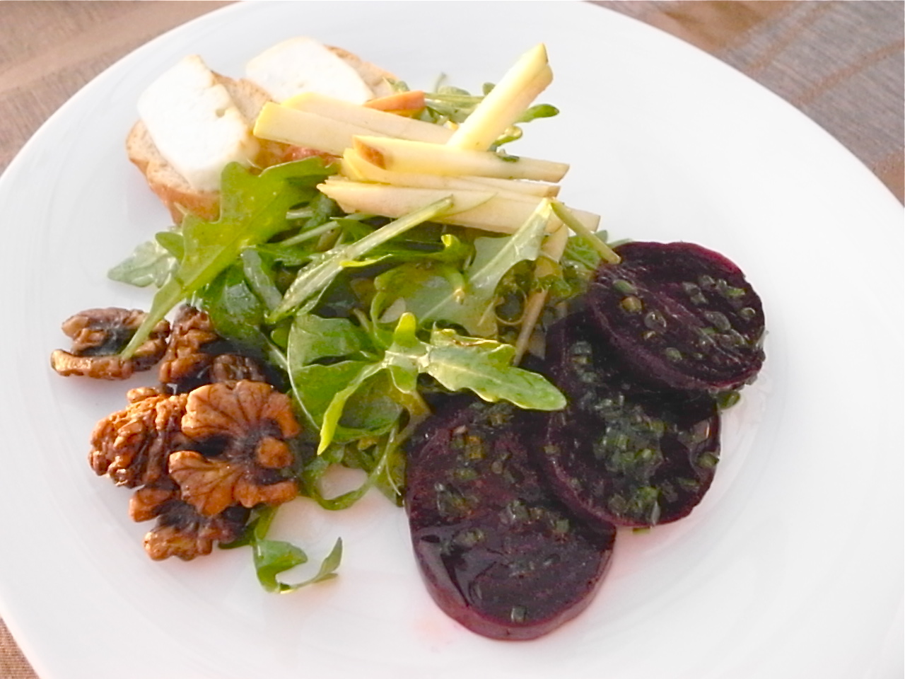 beetroot salada & Chevre crostini Shaved apple & Candied walnuts