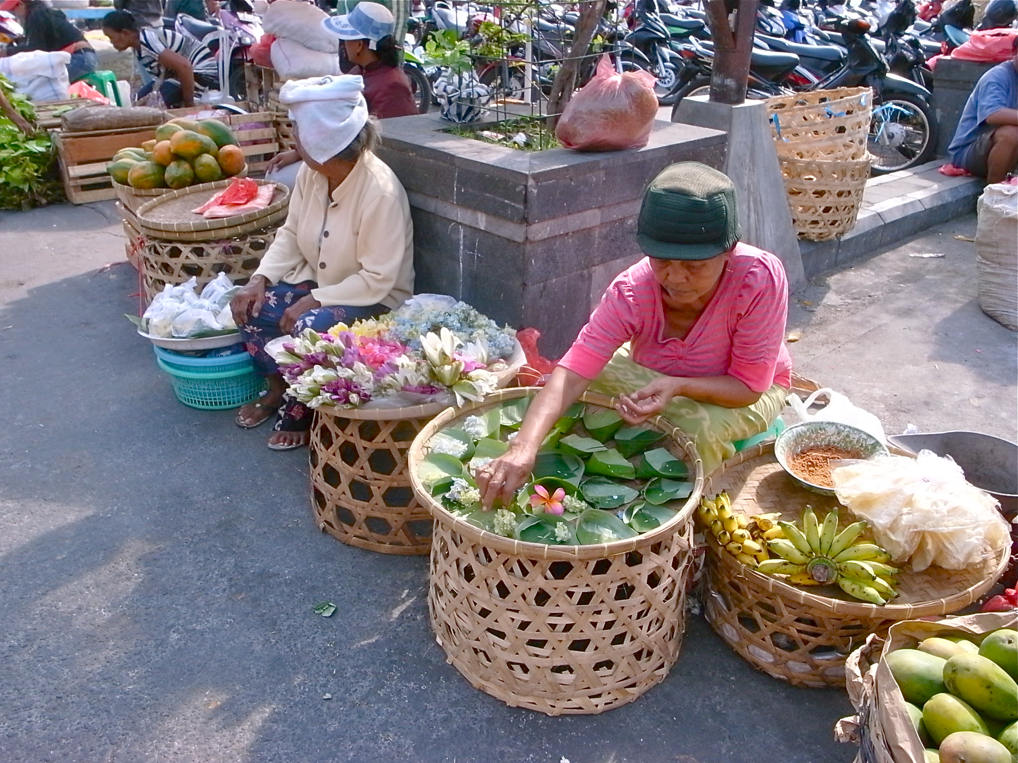 バリ島でお馴染みのお供え物『チャナン』を実際に作って売ってるおばちゃんなんかも。