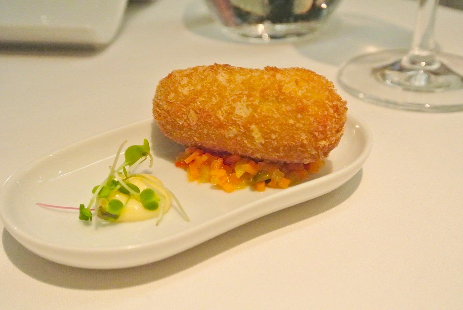 イベリコ豚を使ったコロッケの下には 細かく刻まれたピクルスたち。
