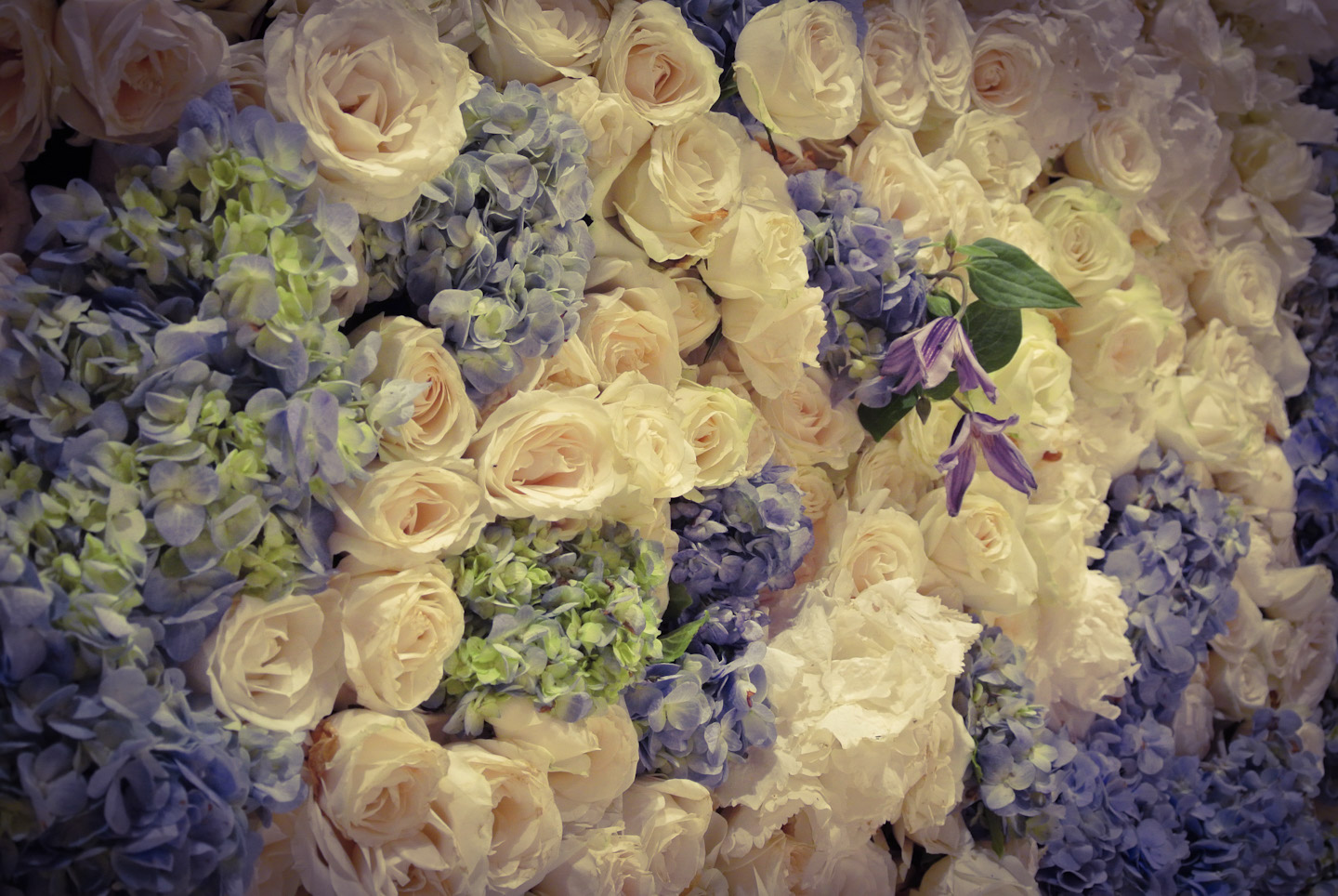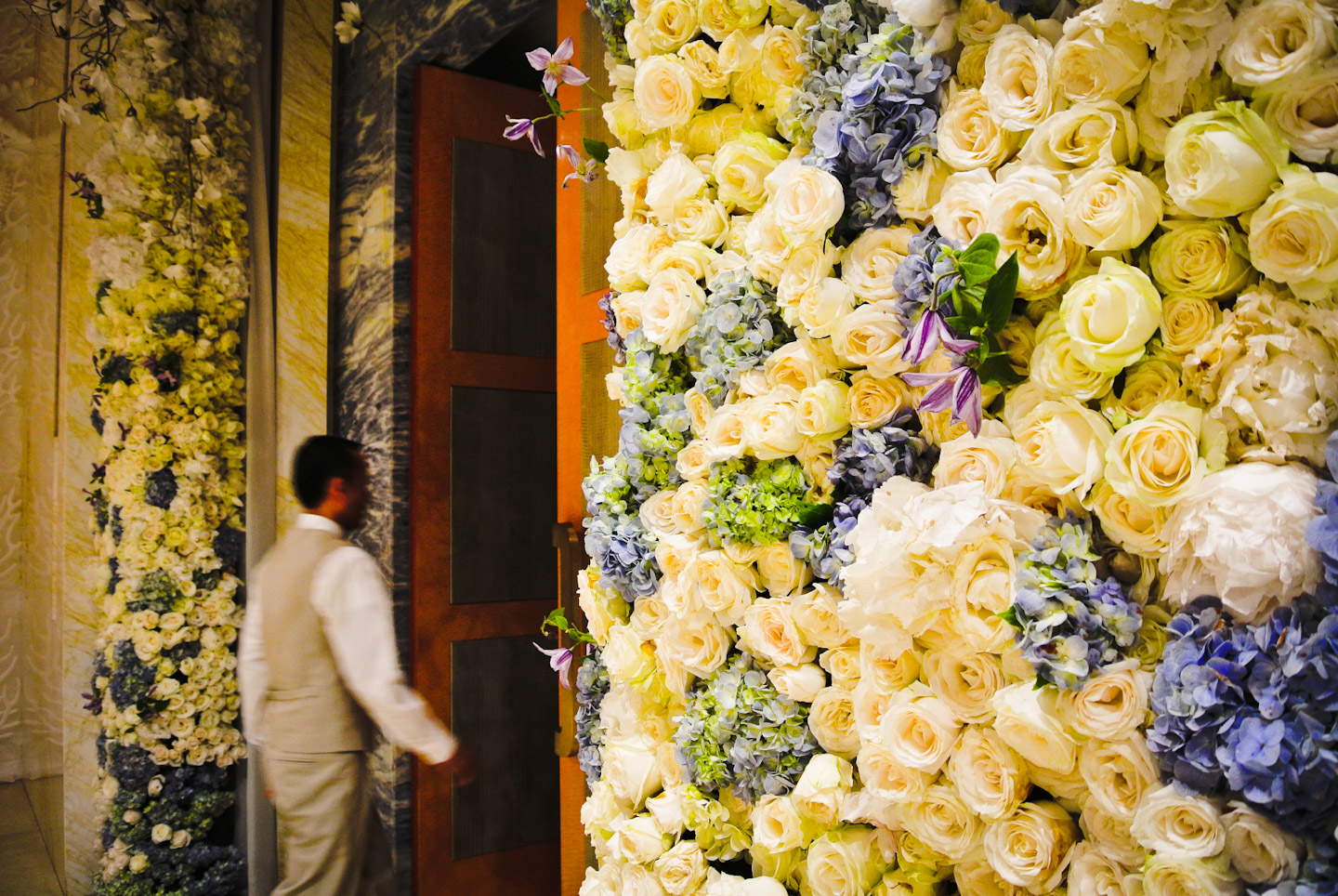 扉の周りには本物のアジサイやバラを使ったアーチが♪
