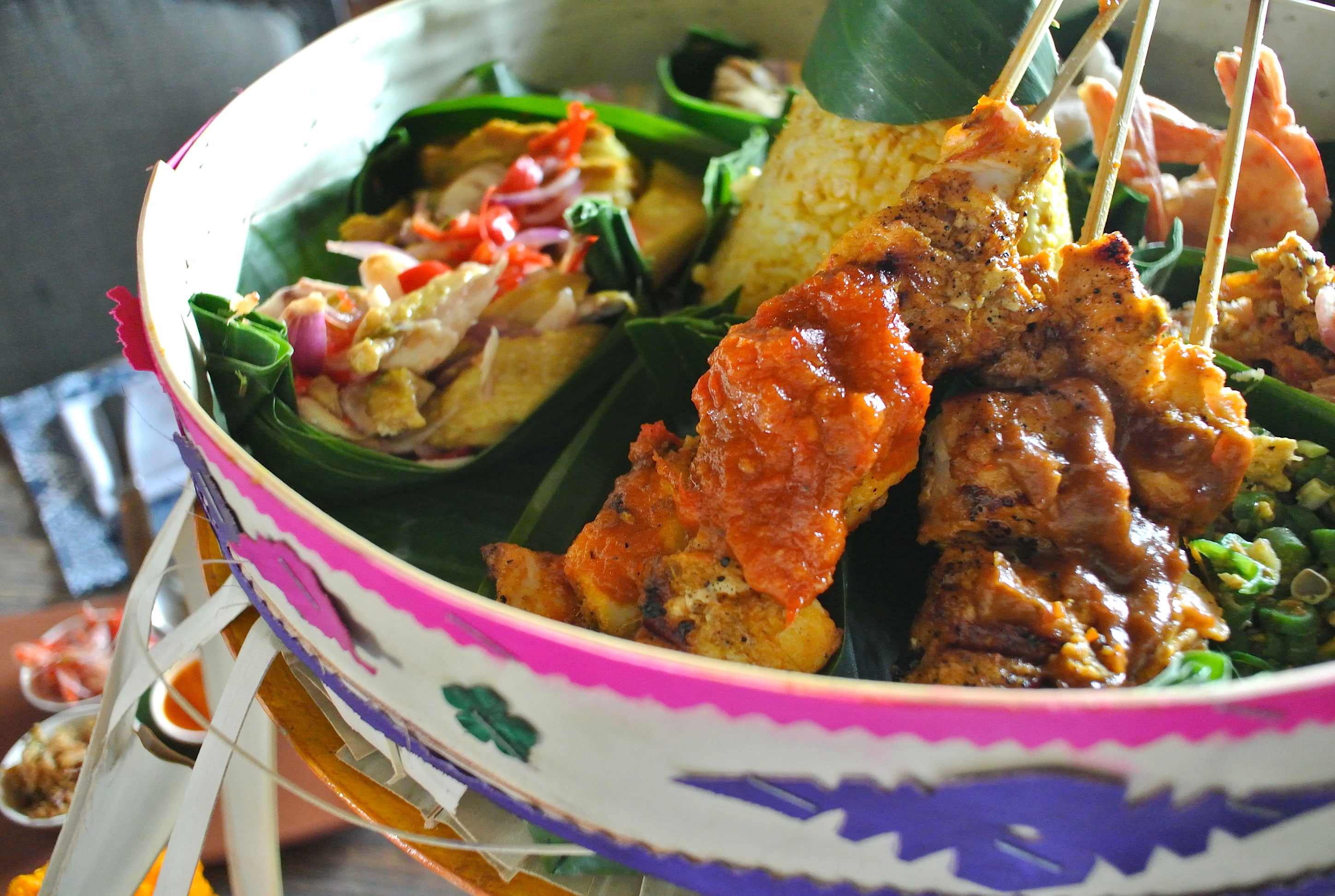 サテ、インゲンとスパイスで和えたラワール、サンバルマタを和えたチキンやお魚。