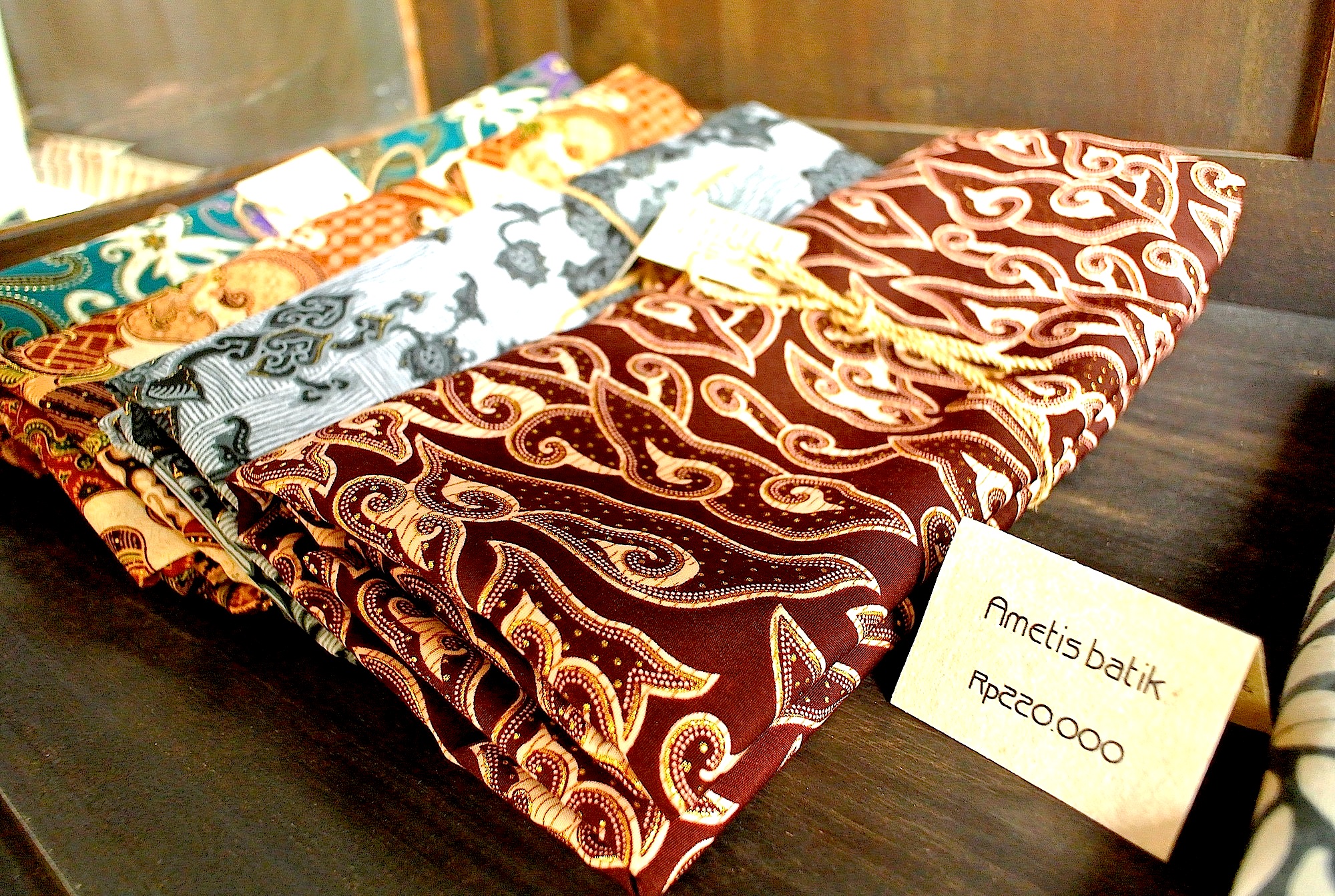 セレクトされたジュエリーや アメティスオリジナルのロゴ入りバティック。