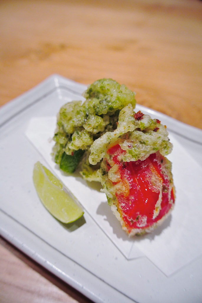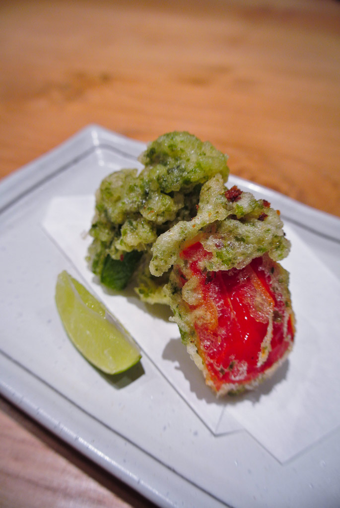 彩り野菜の天ぷらは 青のりを混ぜた天ぷら粉 お好みでおつゆか抹茶塩で♪