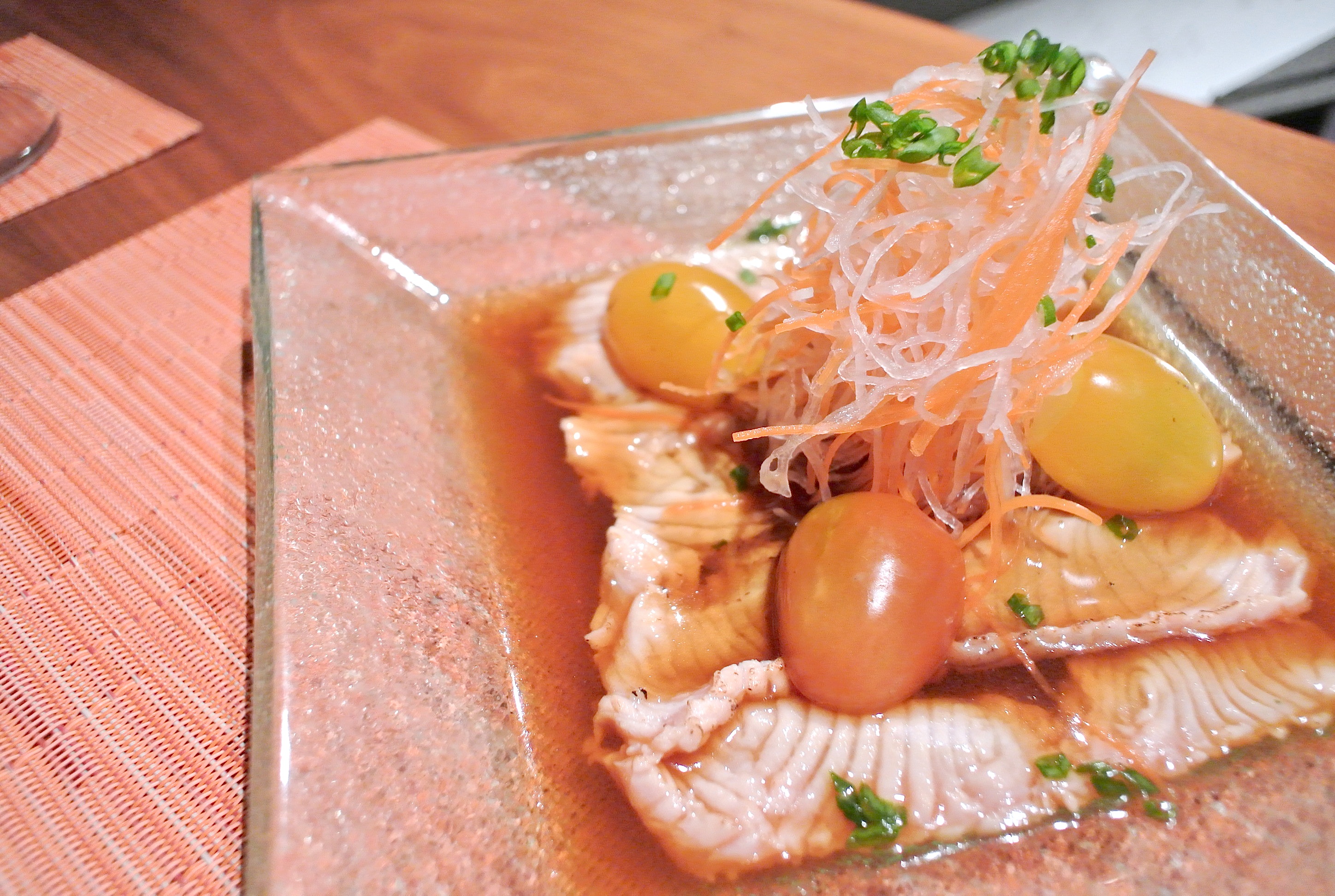 炙りサーモンのカルパッチョ仕立て 彩り野菜 三杯酢 Rp 145,000+21%