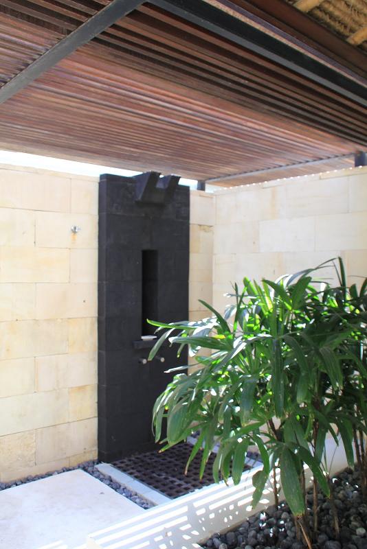 バスルームと、洗面台の後ろには室内シャワーと屋外シャワーまであるんです。