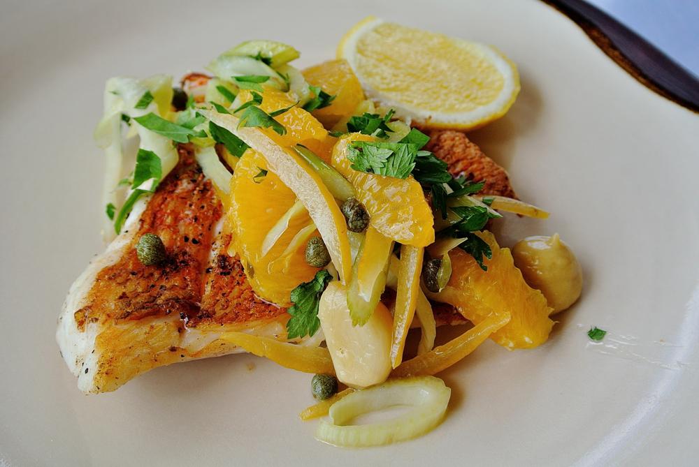 ゴロリとニンニクの固まりやオレンジ、セロリ、ケイパーなどがアクセントになったグリル