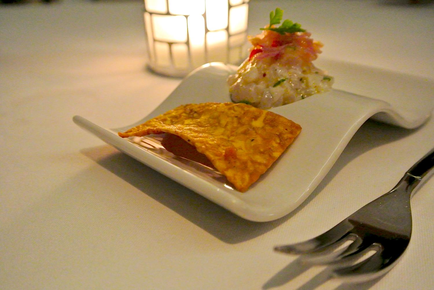 こちらは最初に登場した一品目! 白身魚のセビーチェ ここにサンバルマタが乗っています。