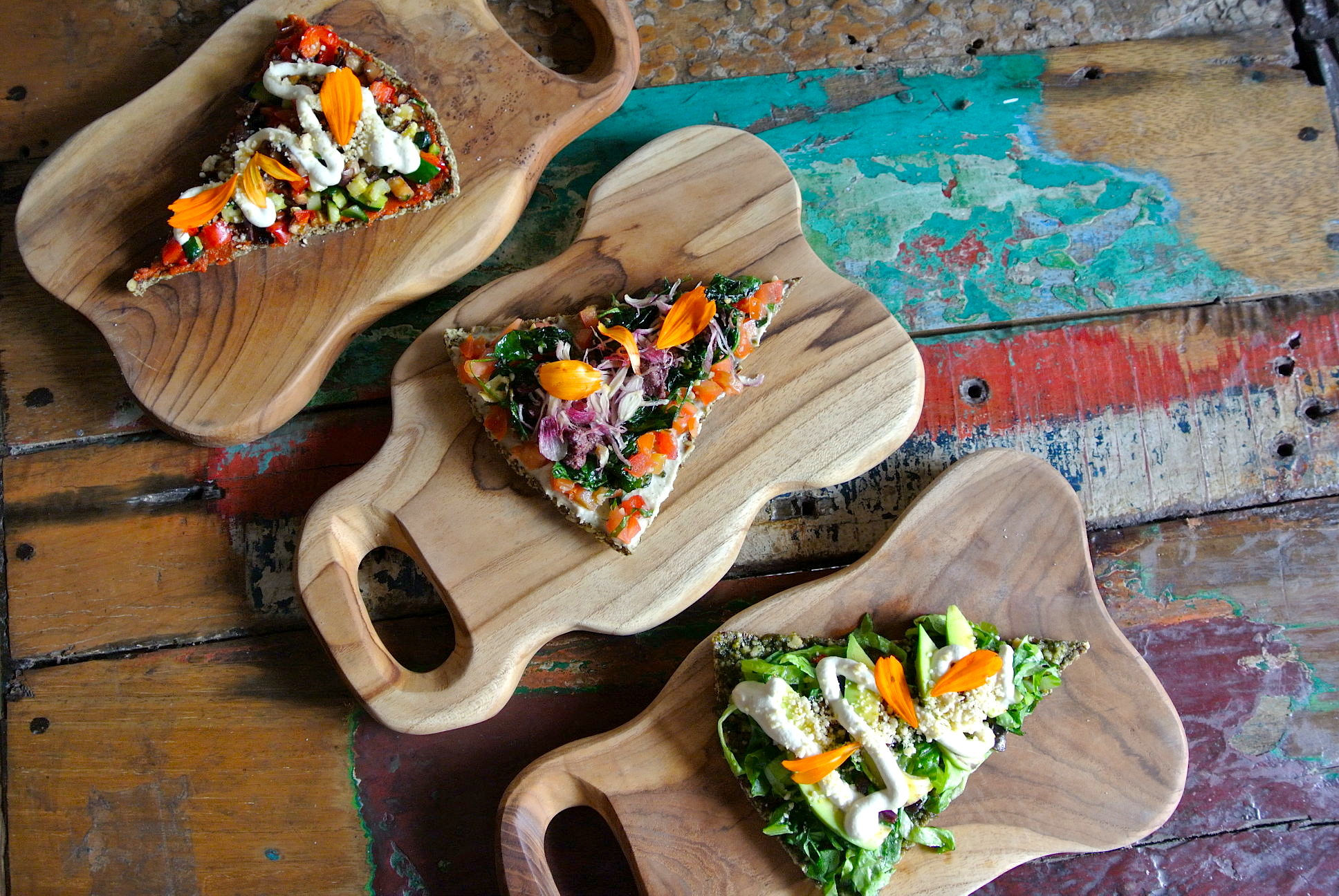 フレッシュ野菜やペーストをどっさり載せた 新感覚のローフードピザ。