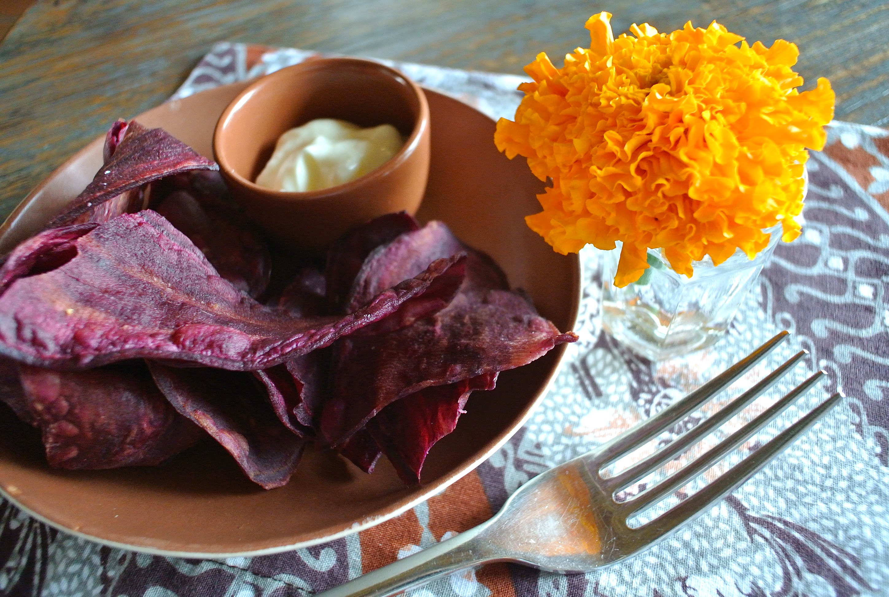お通しで出てくる 紅芋チップス。