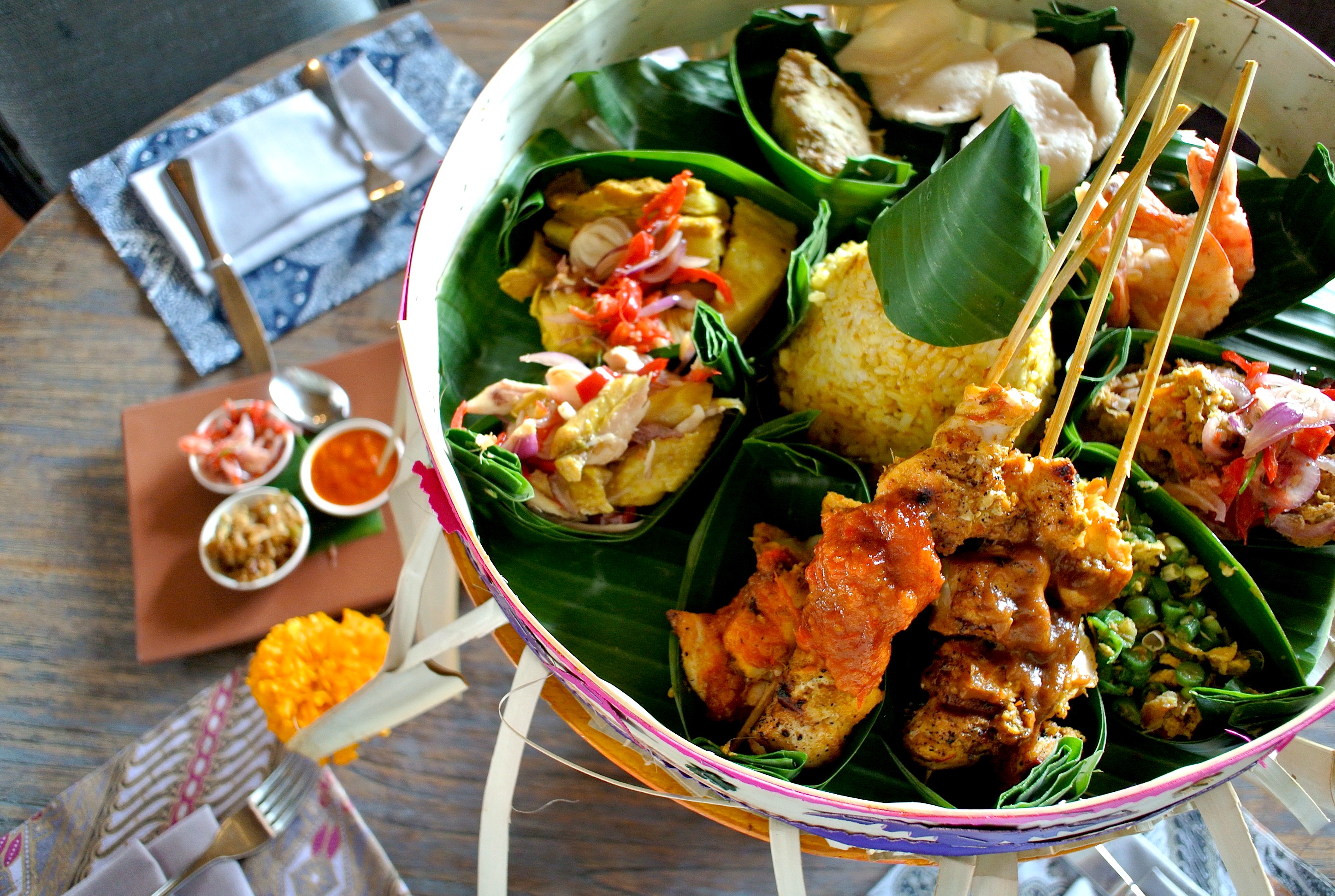 サテ、インゲンとスパイスで和えたラワール、サンバルマタを和えたチキンやお魚。