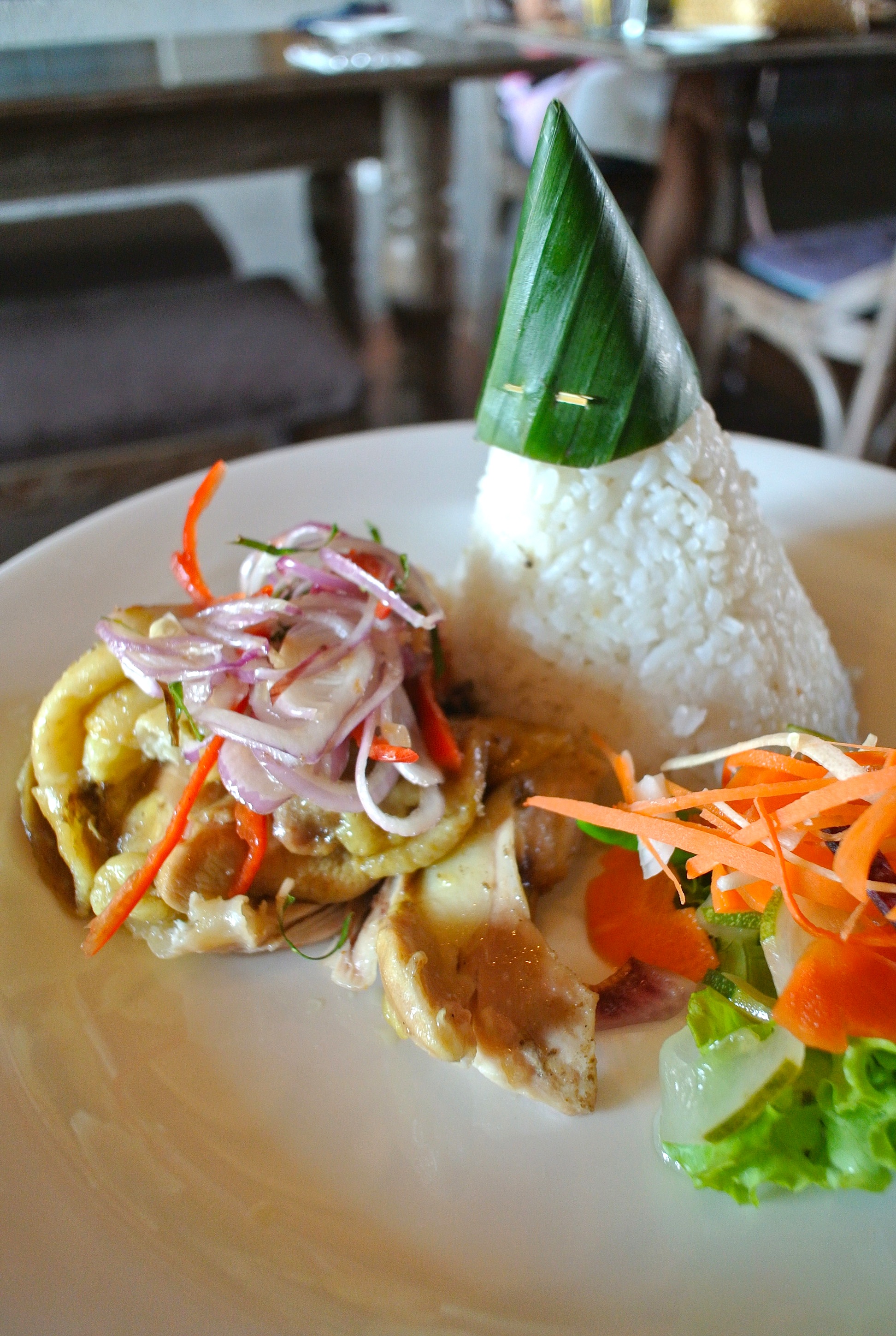 ココナッツライスとグリルチキンのサンバルマタ和え。