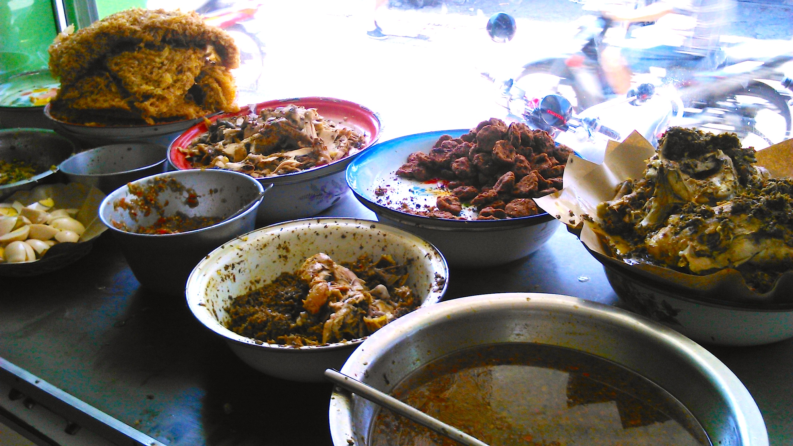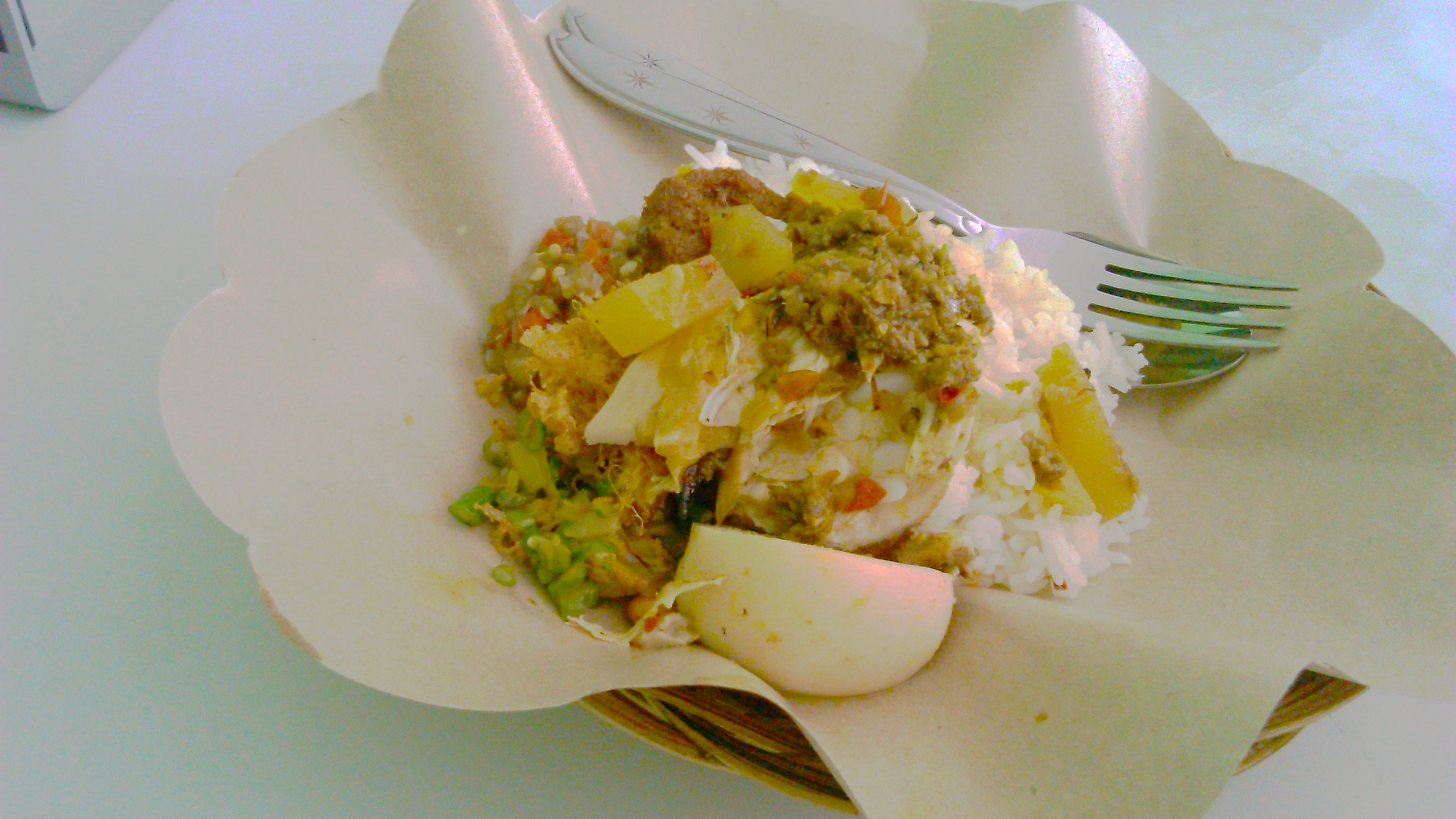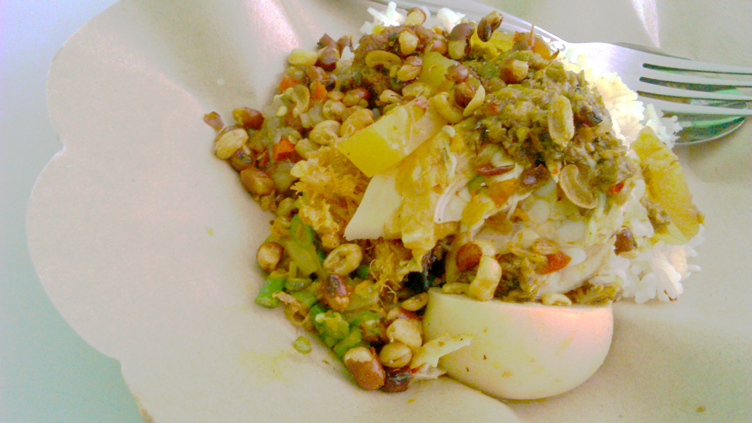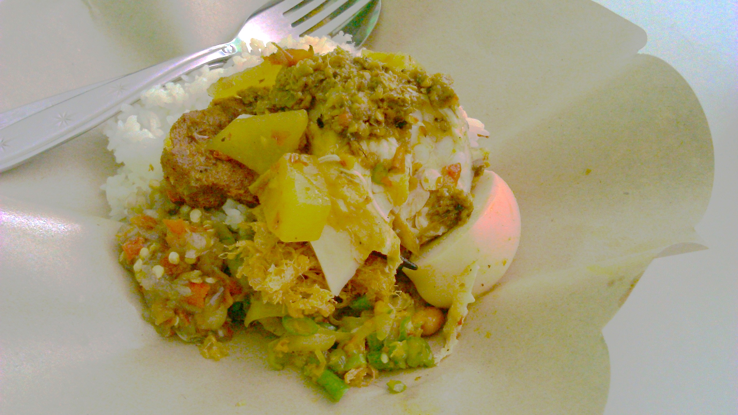 ご飯の上に 鶏肉と野菜、ゆで卵、サンバルマタがごちゃごちゃのってます。