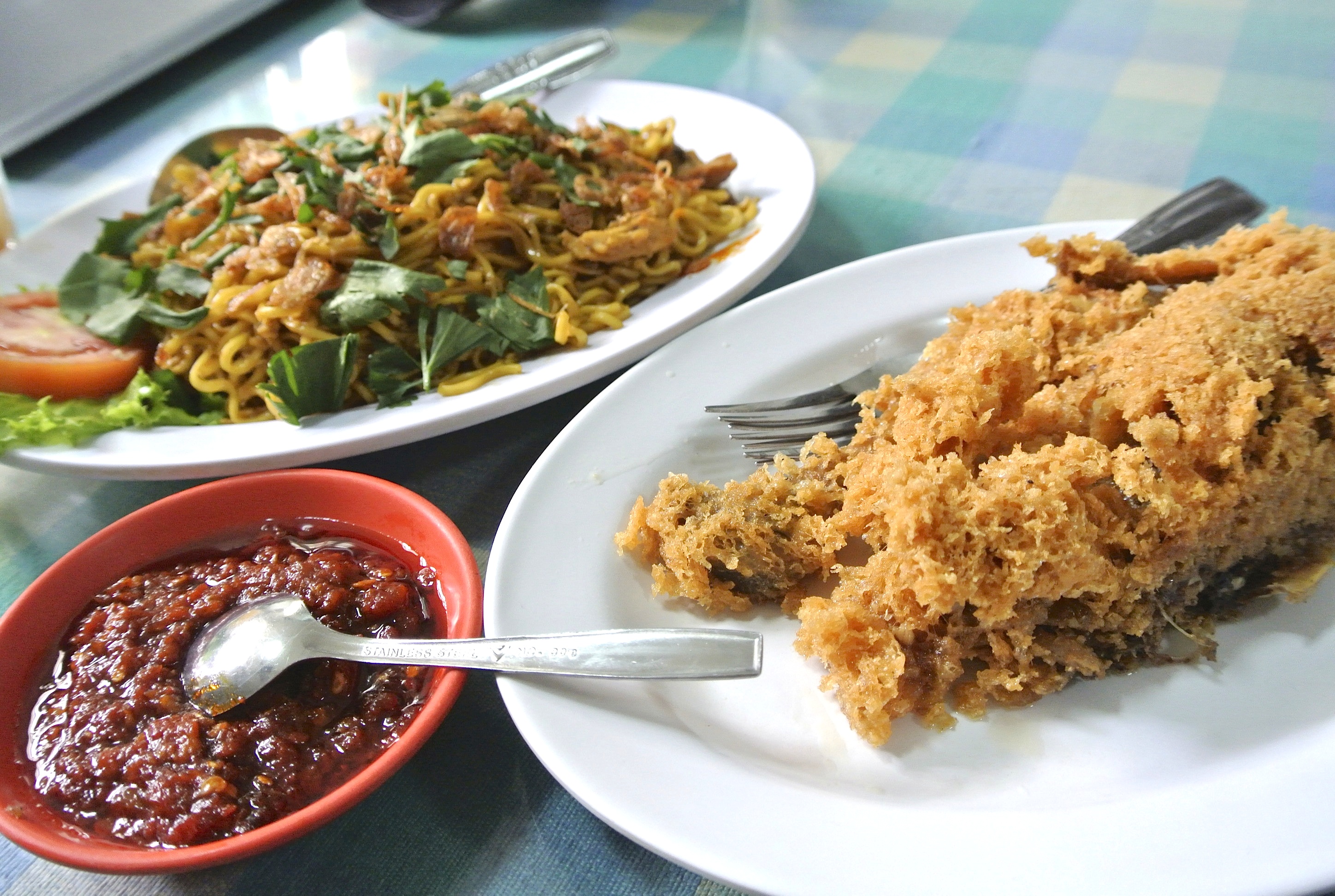 皆さんは 頭から足までついた丸ごと1羽揚げたものを頼むそうですよ。(1羽 Rp 89,500)
