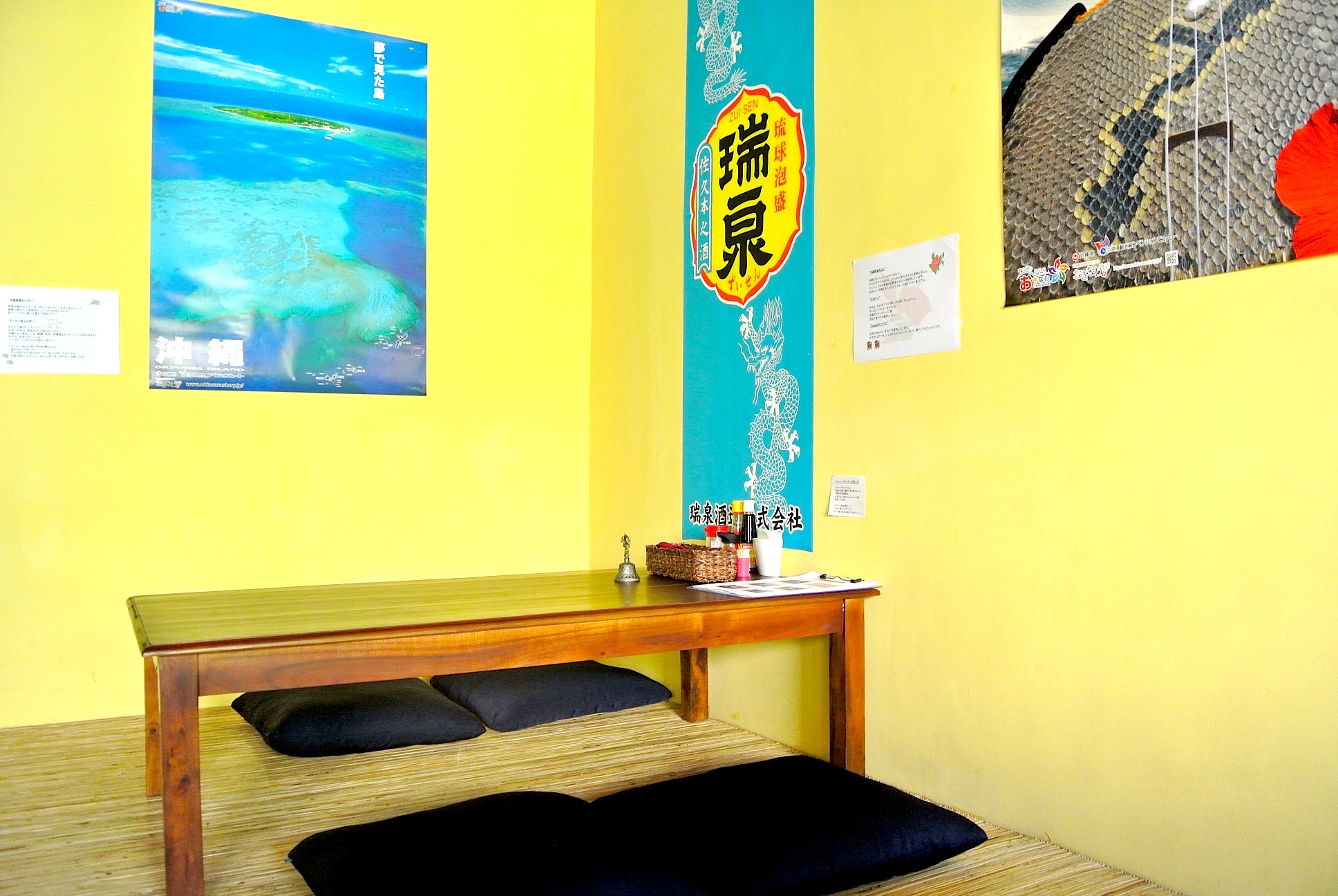 2階部分は座敷テーブルが3つ。 沖縄らしい泡盛のポスターがたくさん貼ってました。