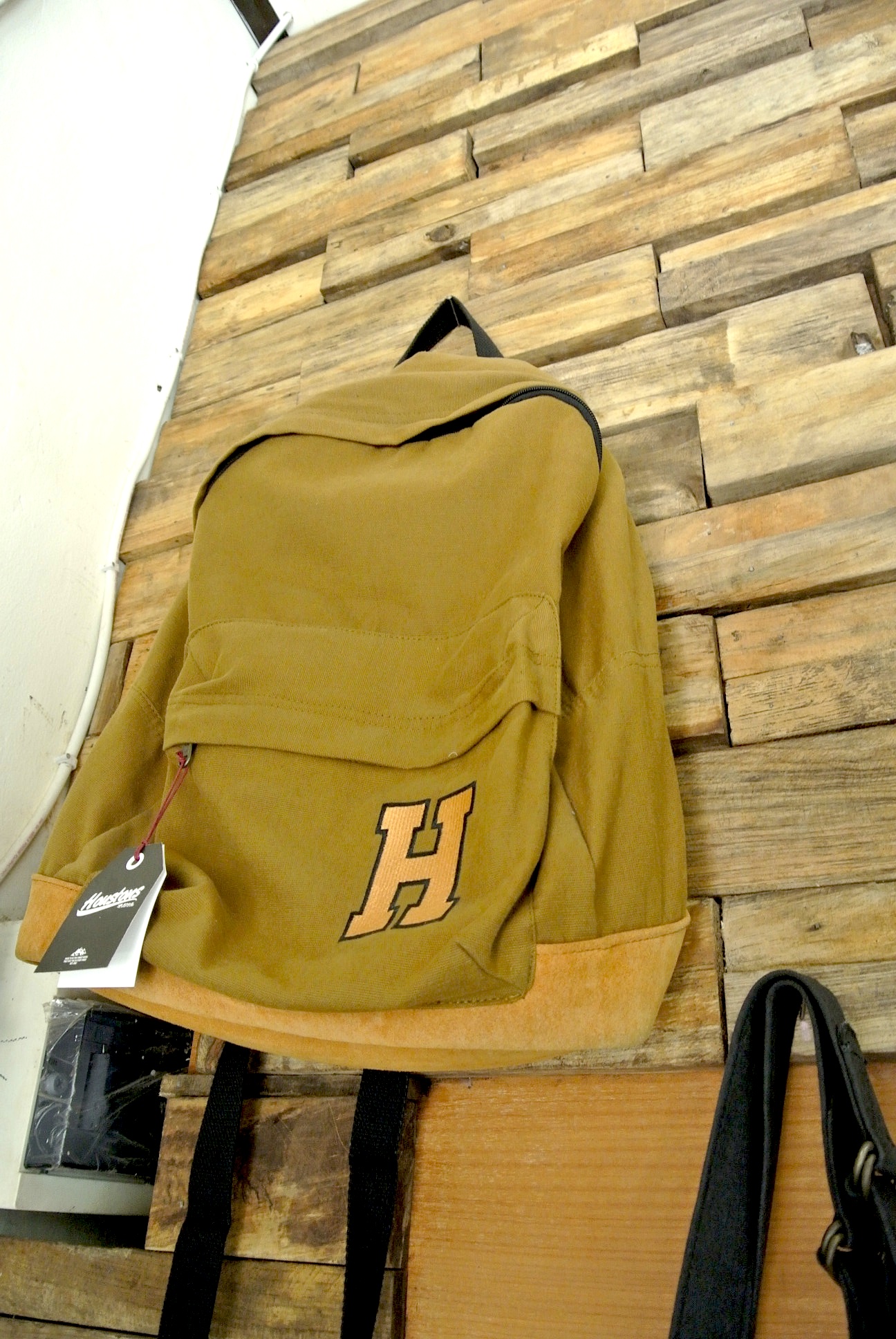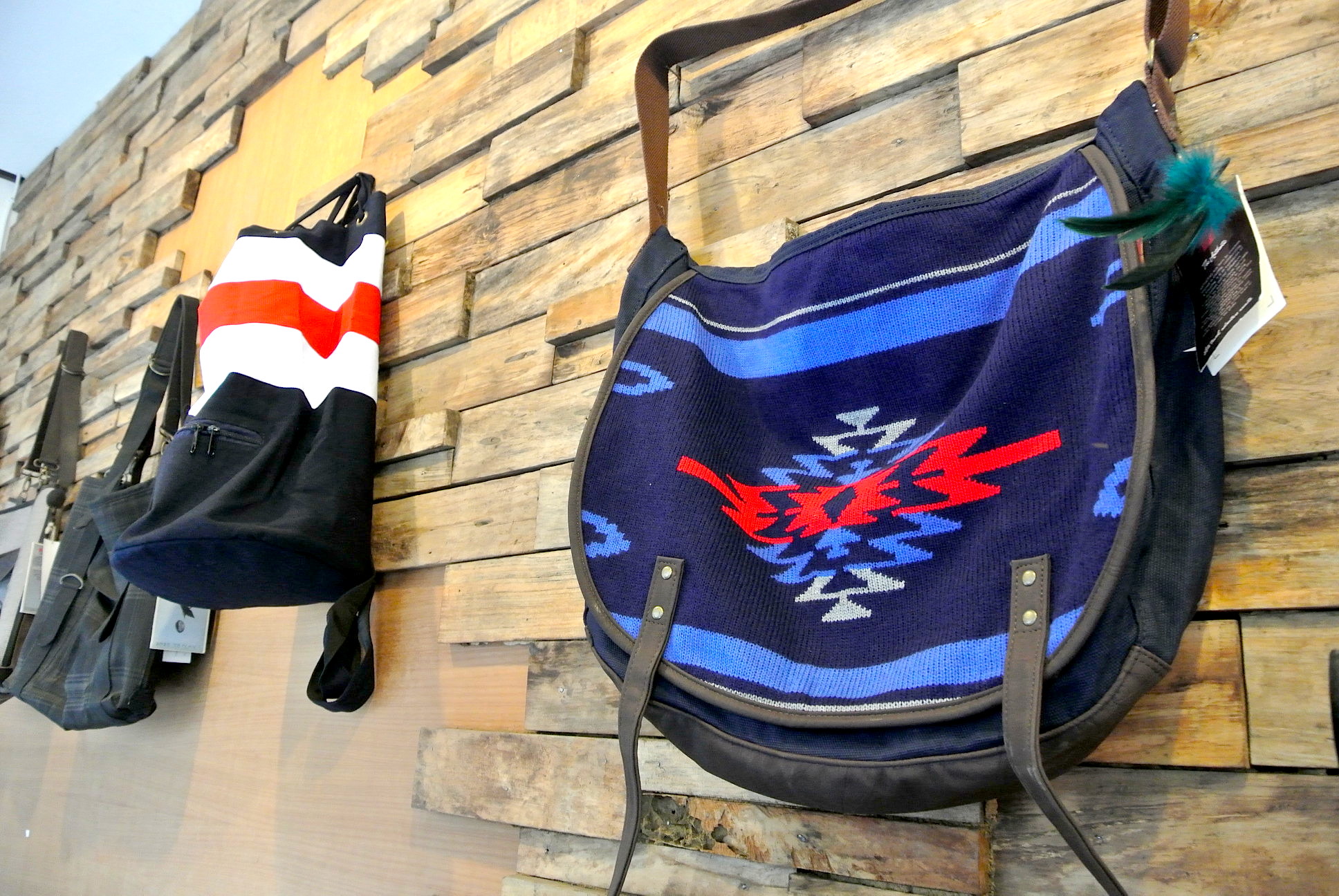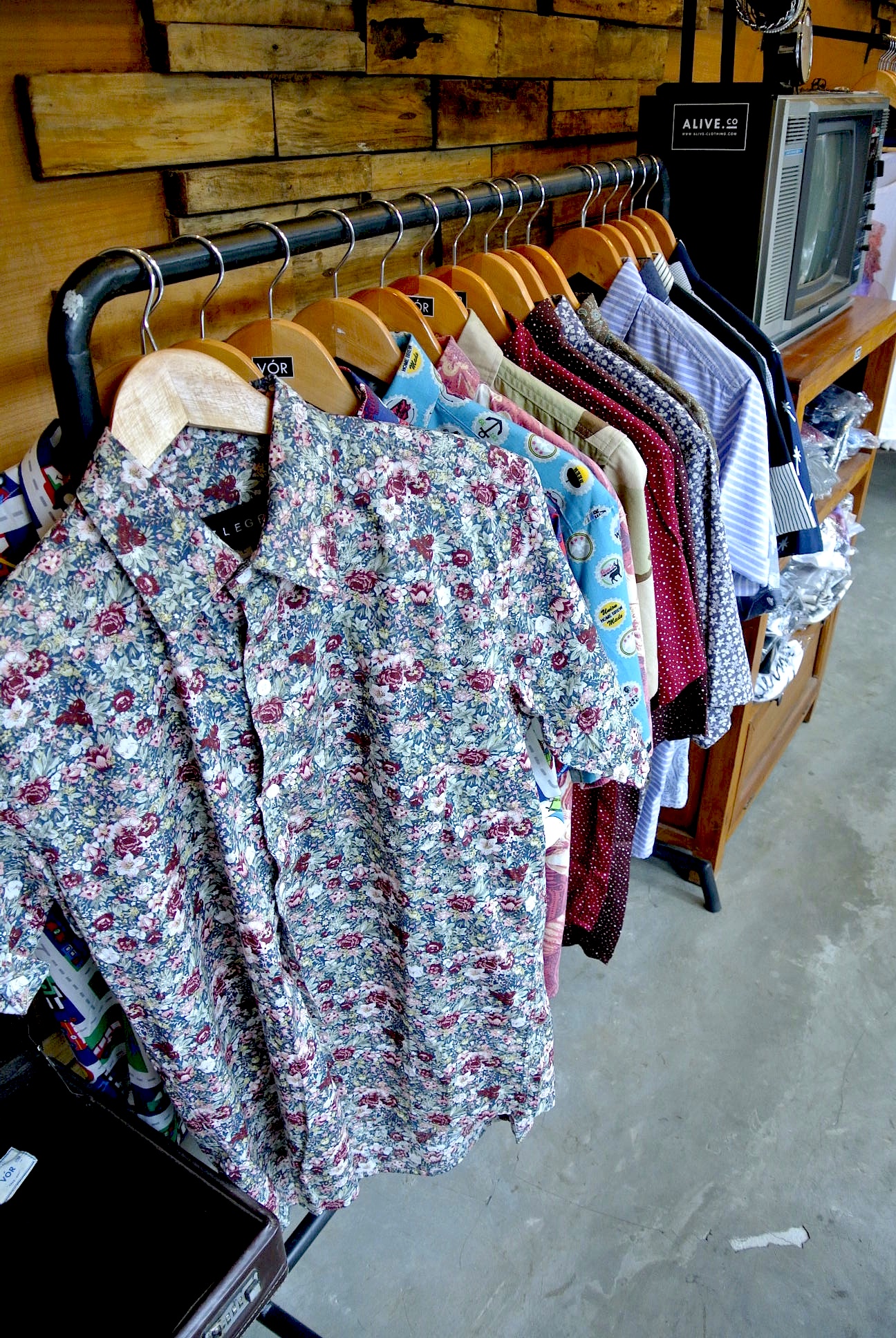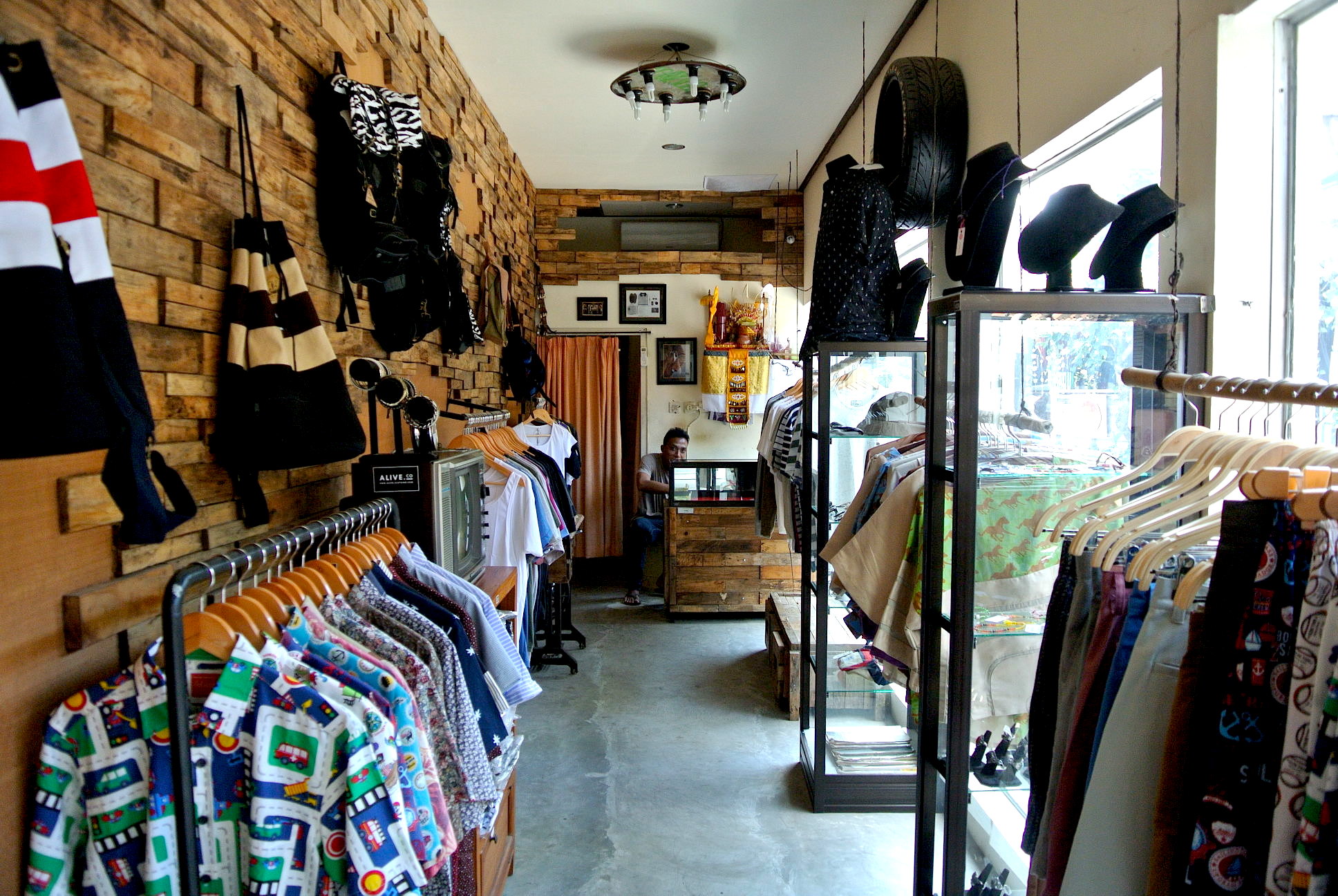 細長い店内には メンズシャツやパンツ、鞄などなど。