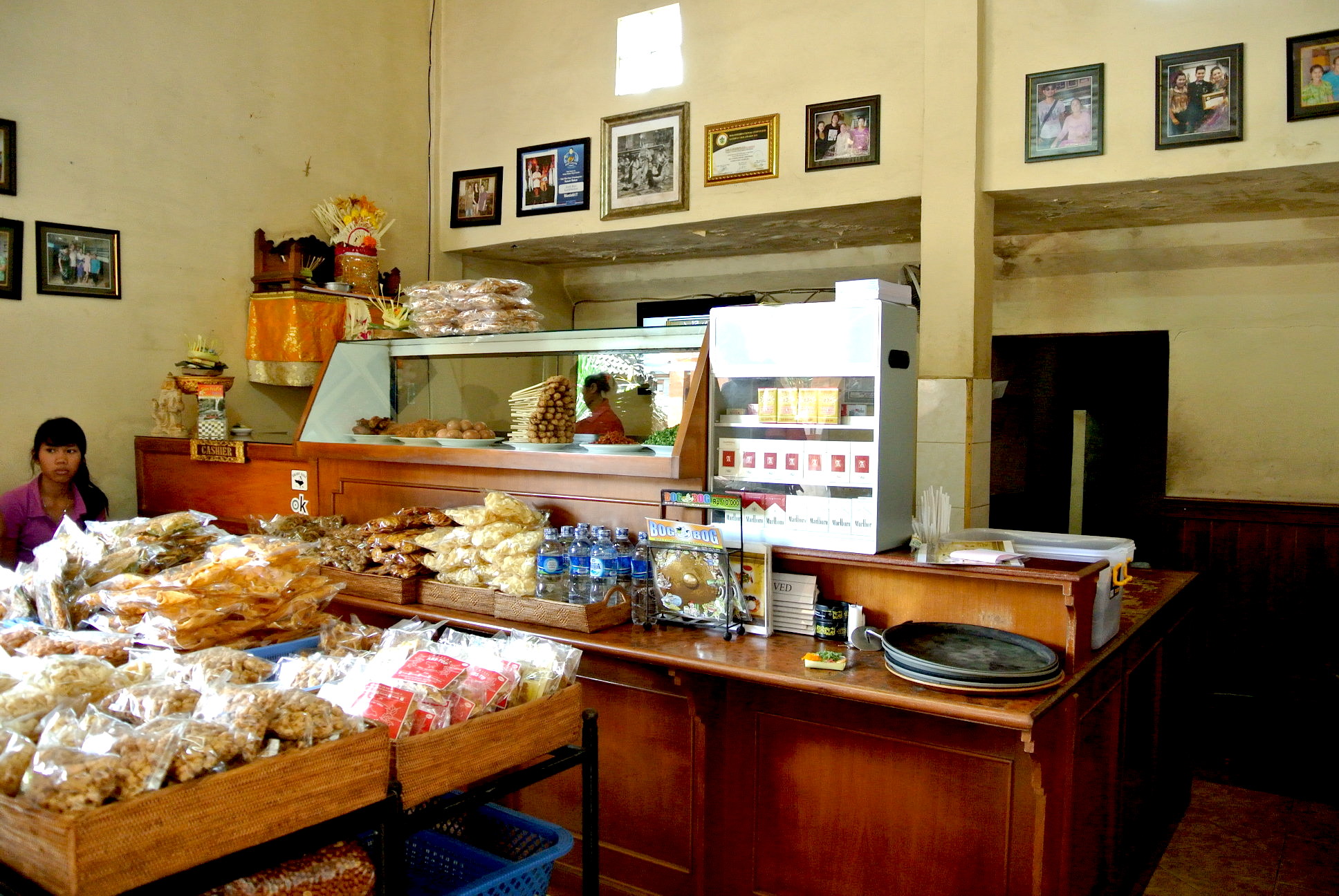 レジの前には大量のクルプ(インドネシアおせんべい的存在)やお豆さん。