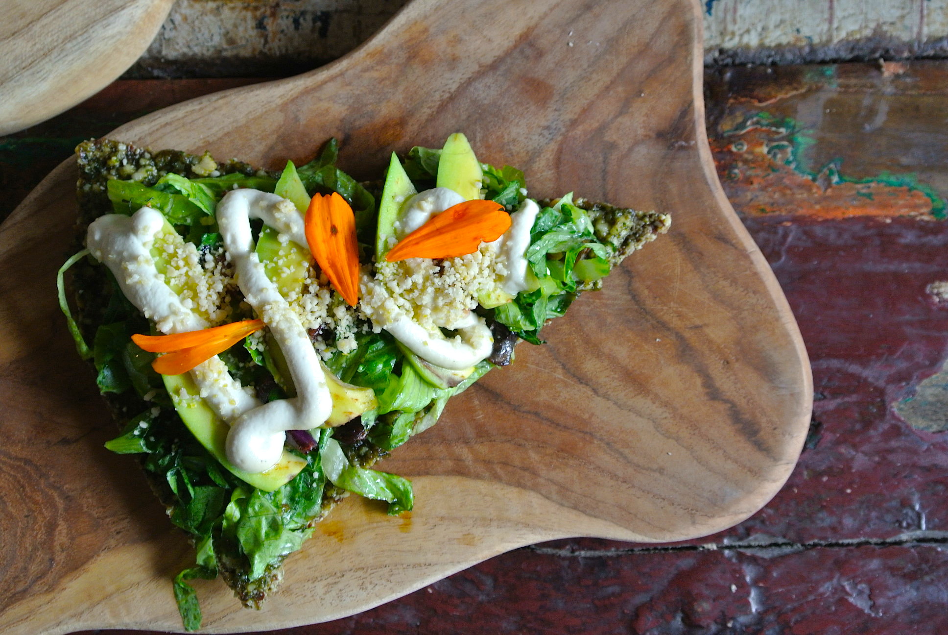 フレッシュ野菜やペーストをどっさり載せた 新感覚のローフードピザ。