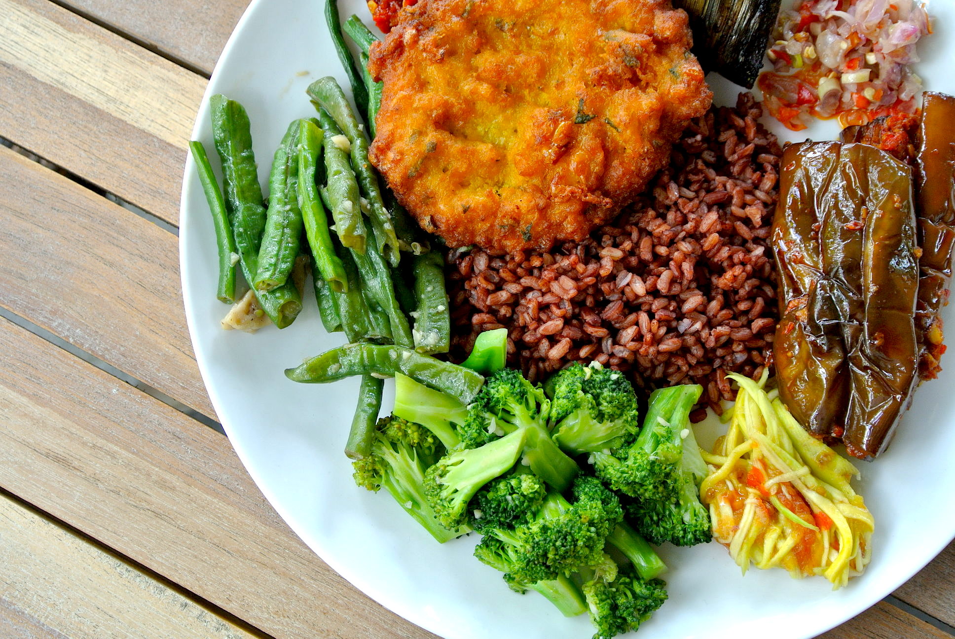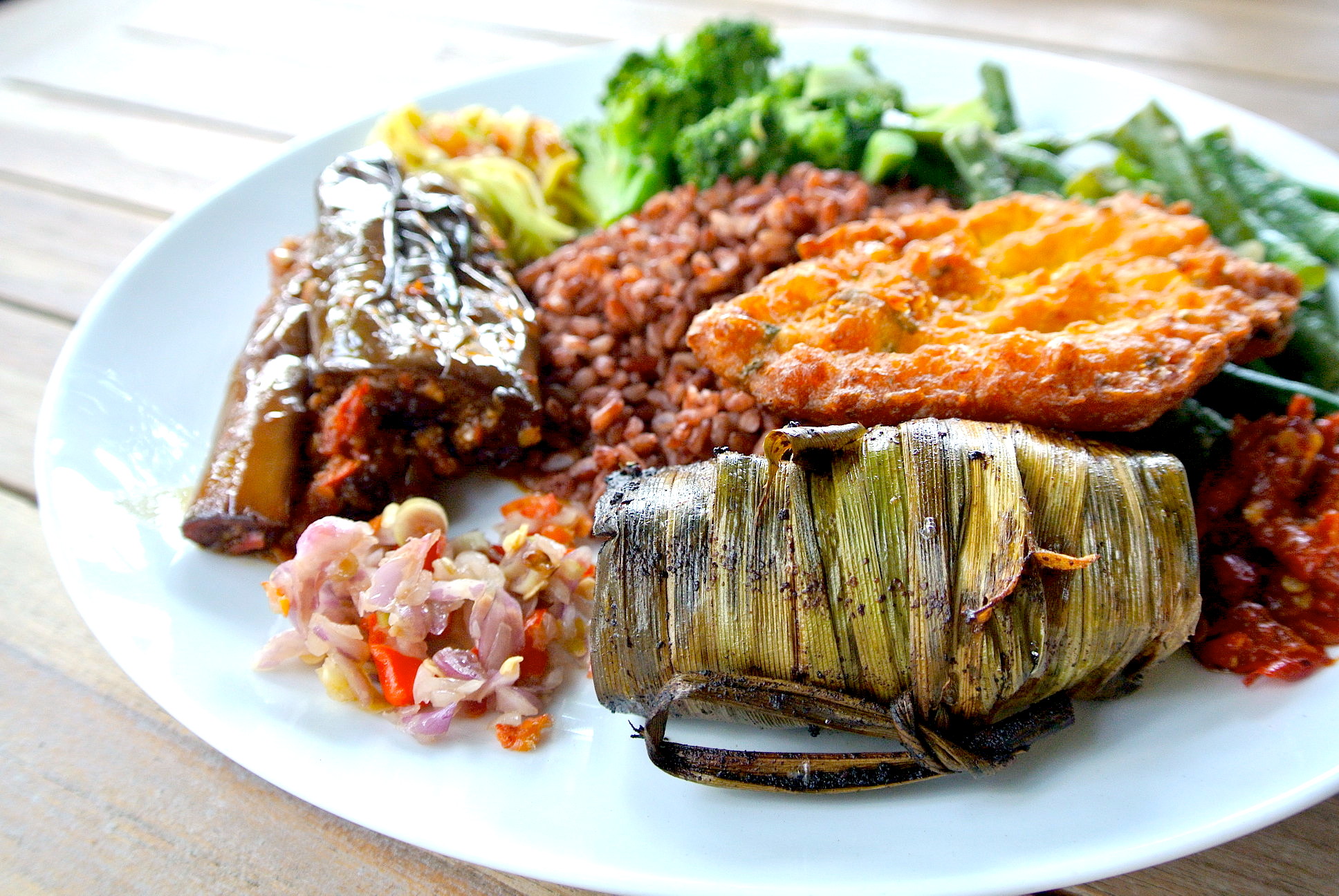 ご飯の種類は3つあって ナシプティ(白飯)、ナシクニン(黄色飯)、ナシメラ(赤飯) が選べる。