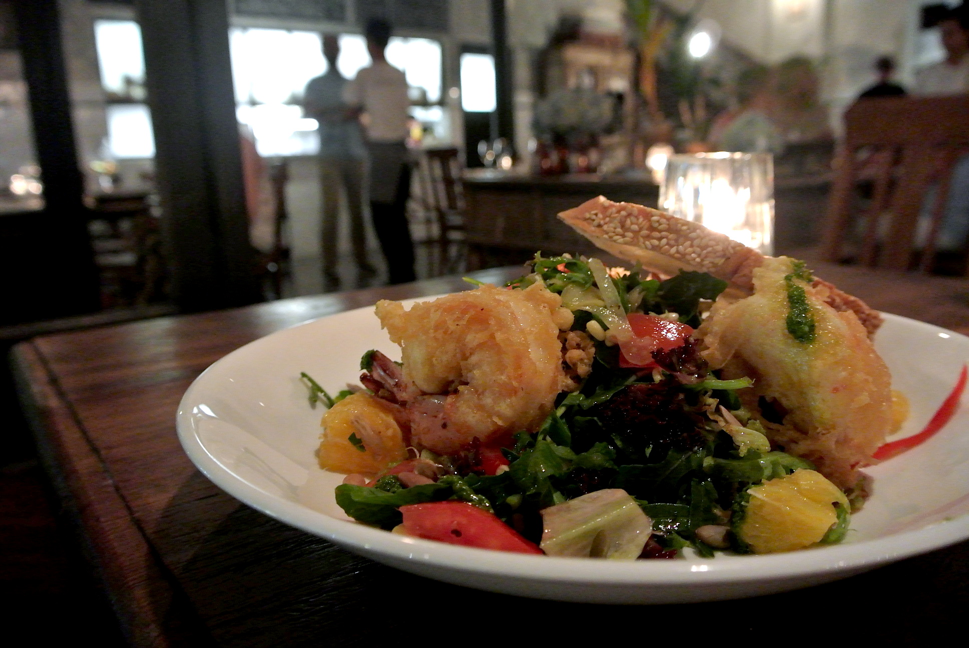 Fresh Tiger Prawn, beer batter, garlic, lemon, ?citrus?salad ?Rp 95,000+16%税サ