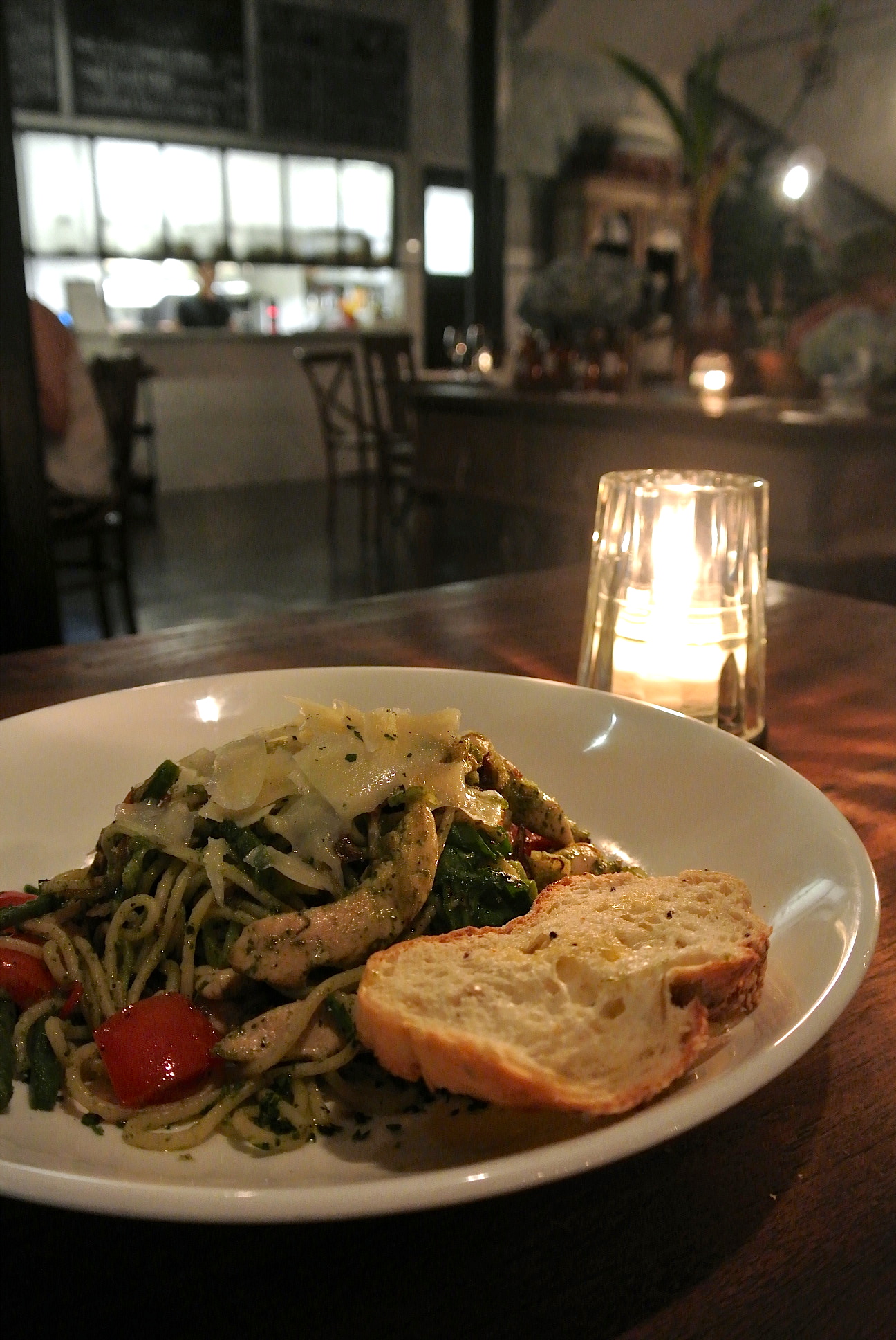 右:Thin Spaghetti with chicken, shallot, chill, tomato, olive oil, rocket ?Rp 72,000+16%税サ
