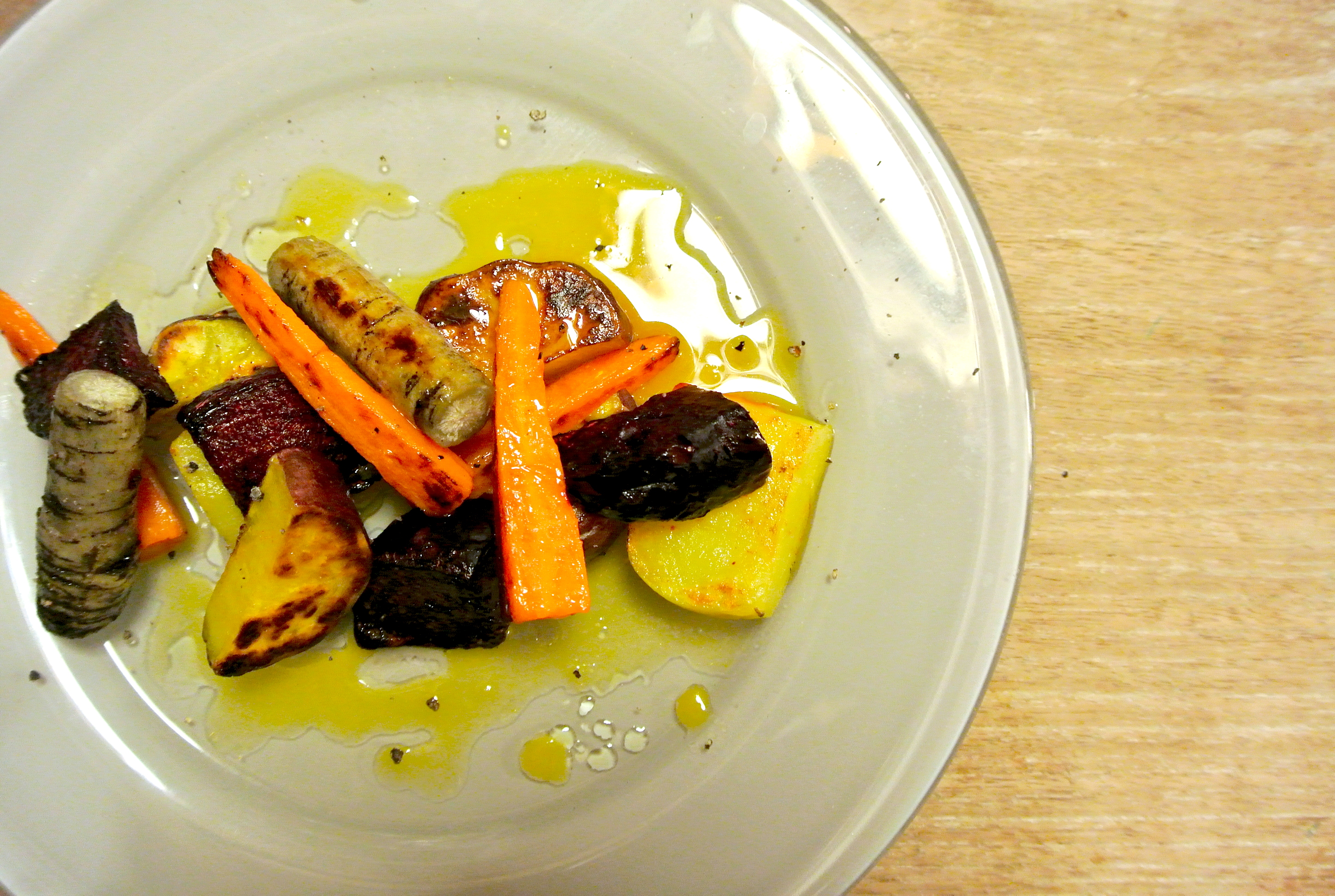ゴボウ、サツマイモ、人参、ビートルートをオリジナルのオレンジドレッシングで。