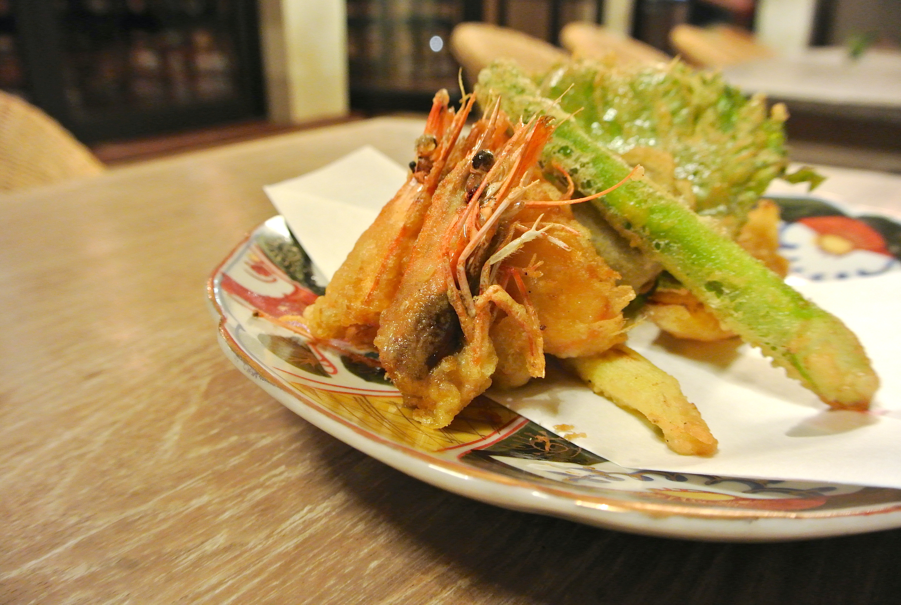 大葉、アスパラ、海老、お魚、椎茸のカラっと揚がった天ぷらたち。
