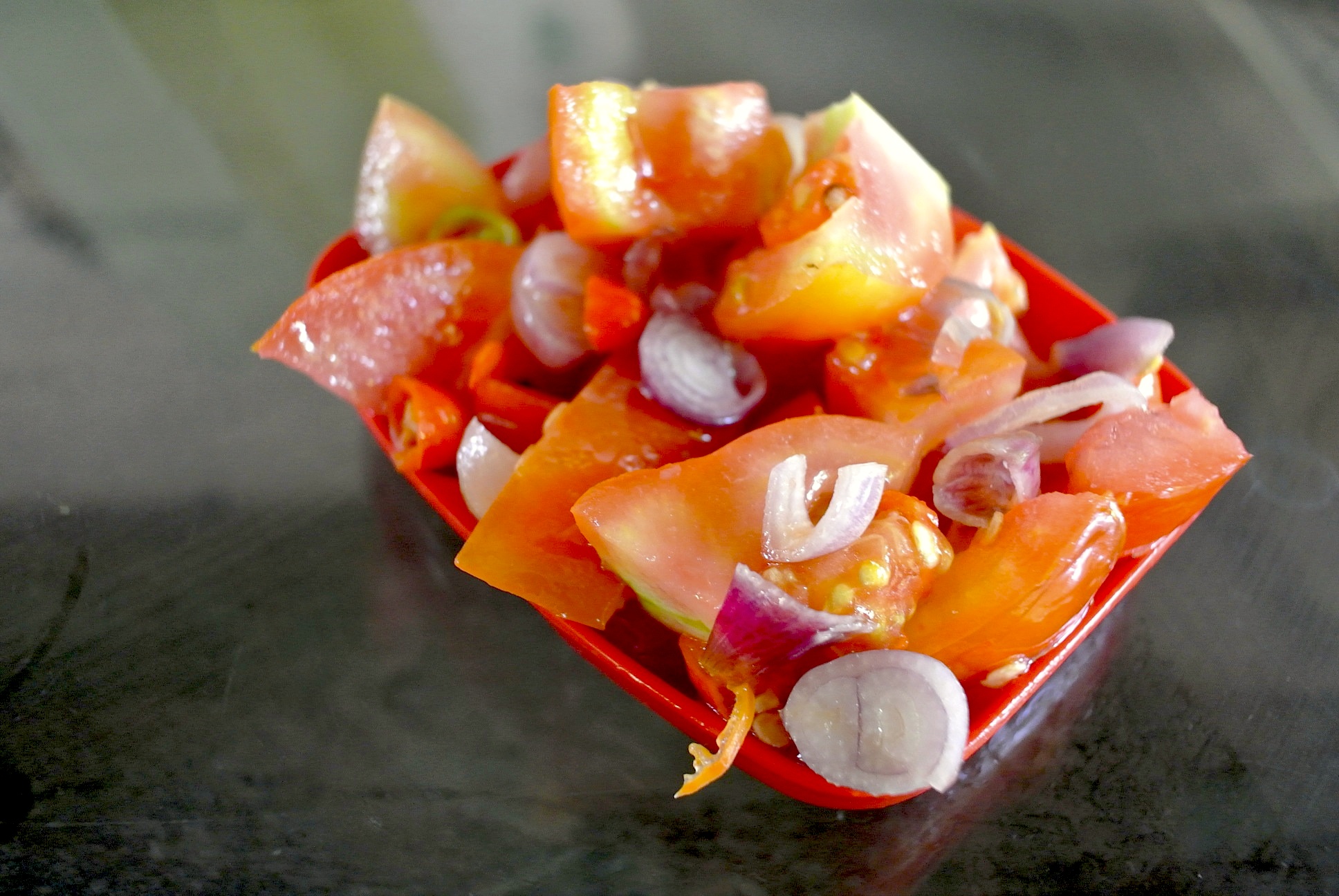 バワンメラ(エシャロット)、トマト、生唐辛子が入ったサンバル。