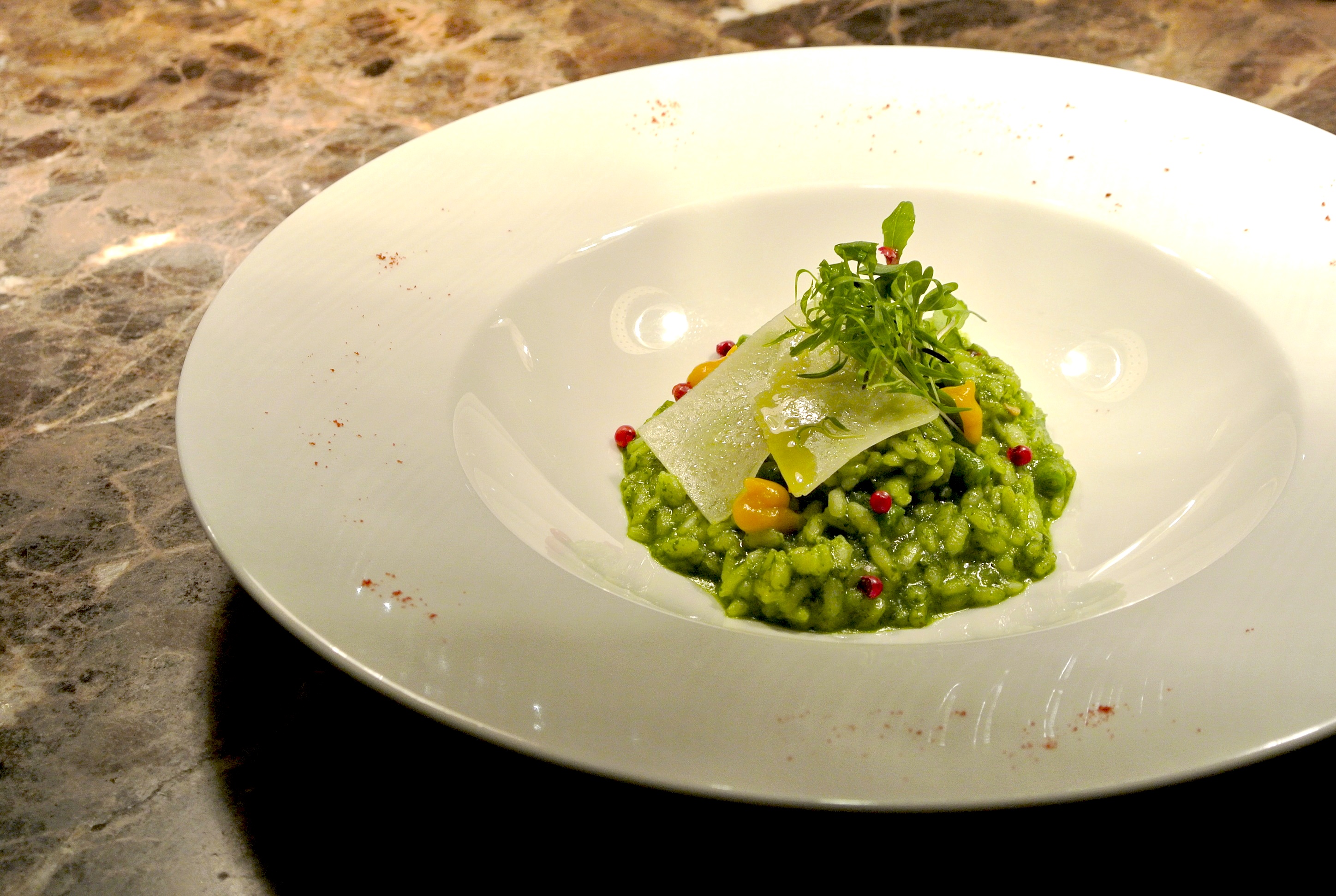 パセリピューレを効かせたリゾット。ピンクペッパーの刺激がベストマッチ!