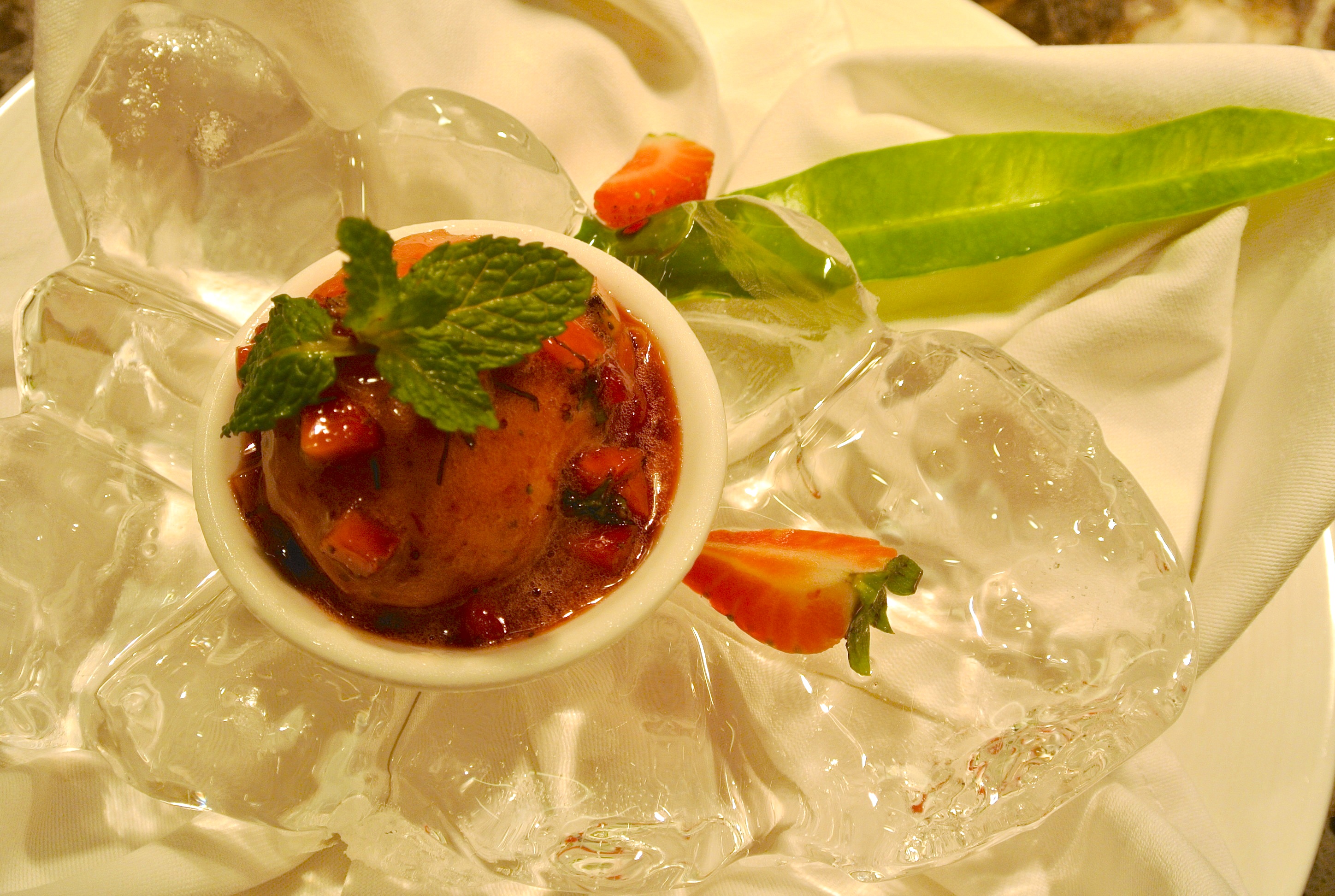 イチゴとバルサミコのソルベ ミントの葉のキャンディー
