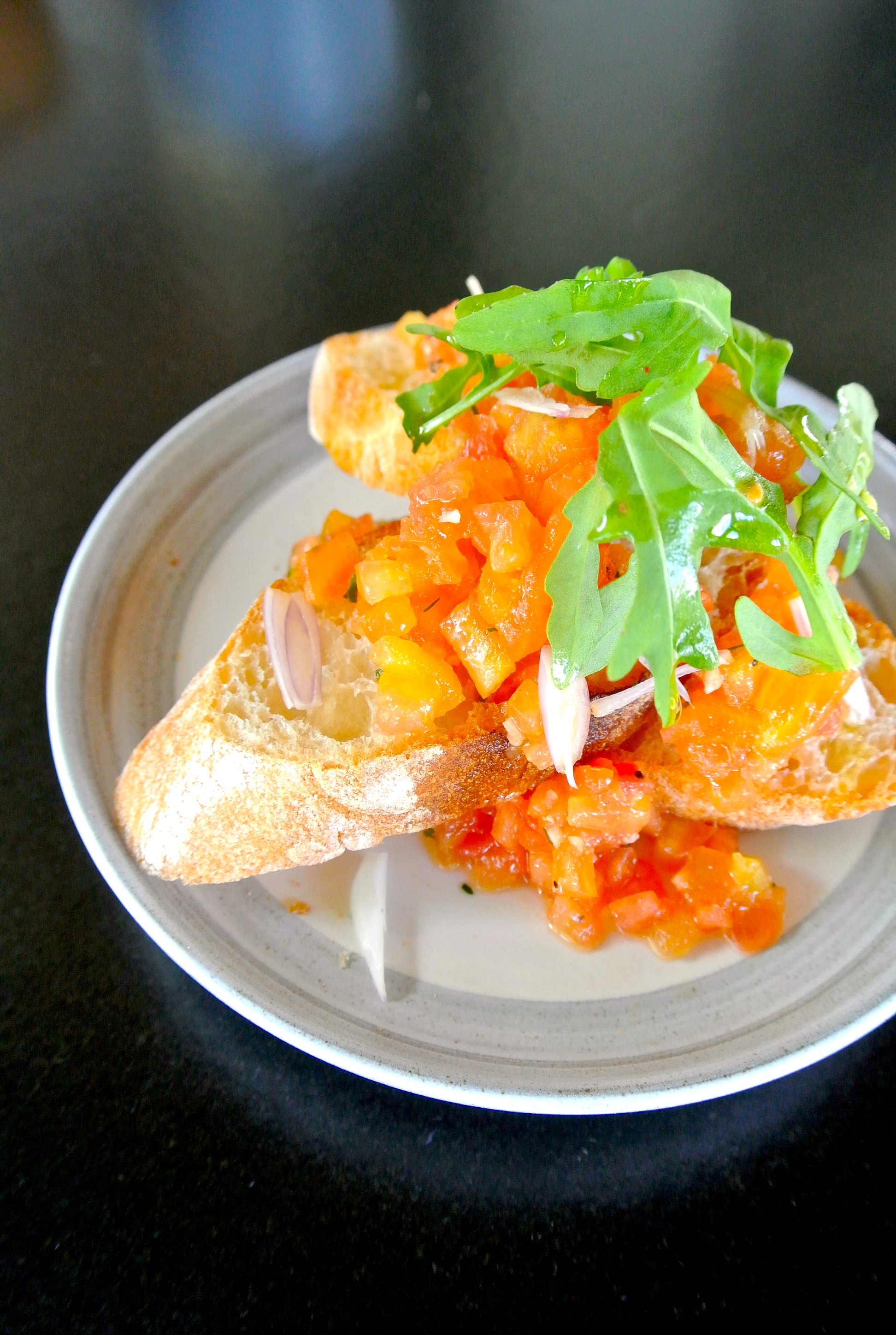酸味の効いたフレッシュトマト、ヴァージンオリーブオイルのブルスケッタ。