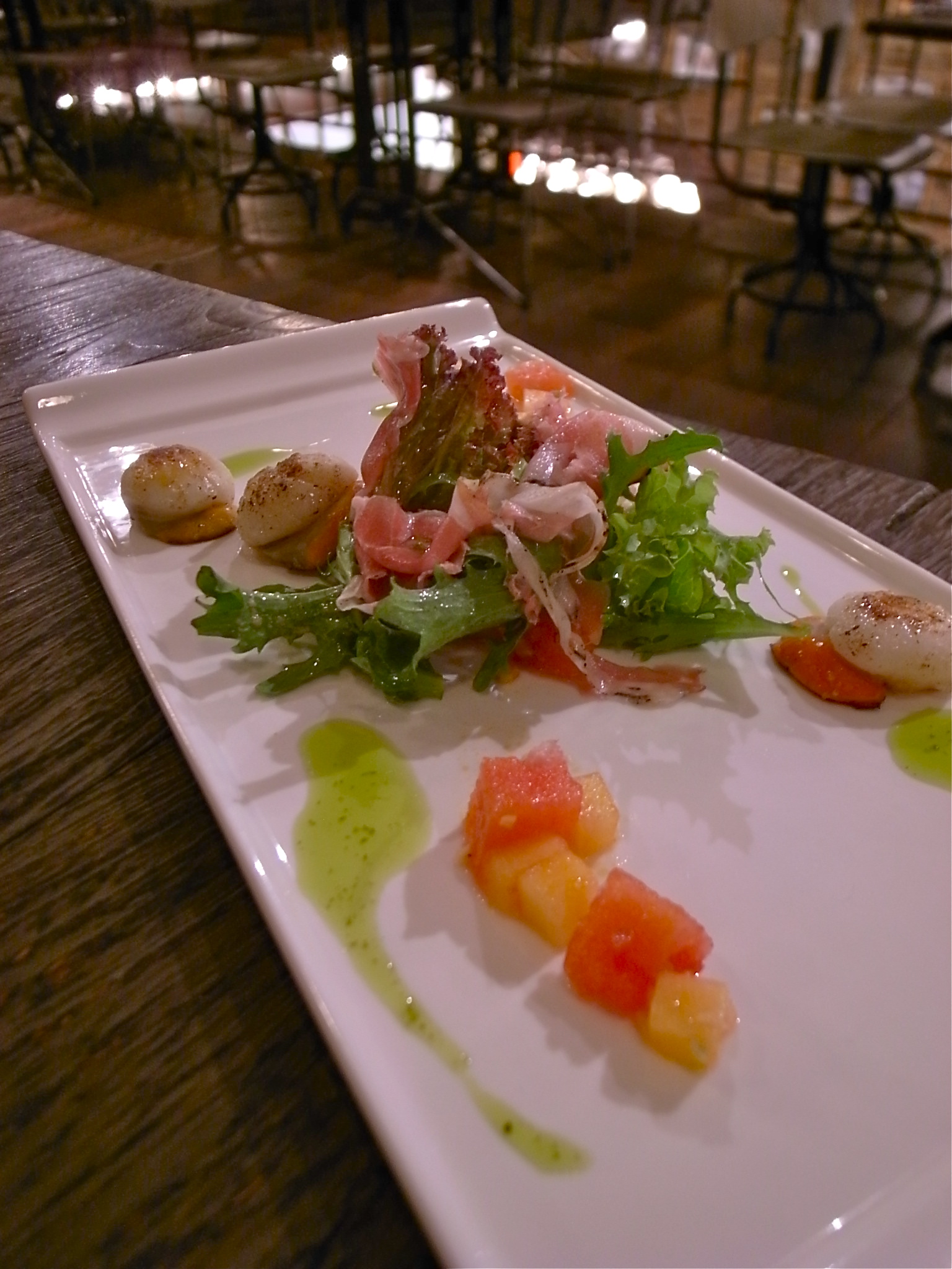 Pan Fried Scallops ( Melon,Ginger salsa,Parma Ham,Herb salad) ?Rp 65.000+16%税サ