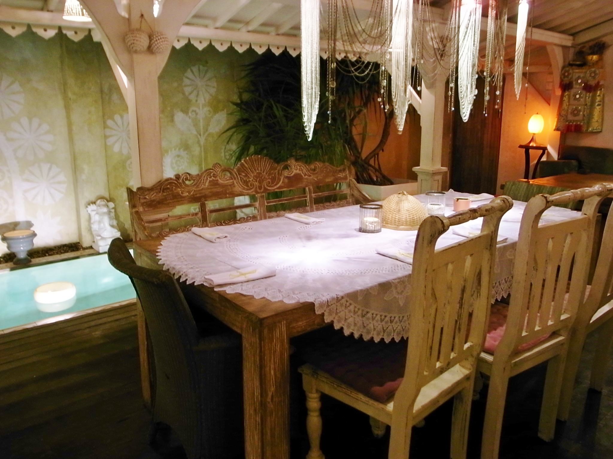 コロニアル調でレストラン内には小さな池?プールみたいな?いやただの水溜め?