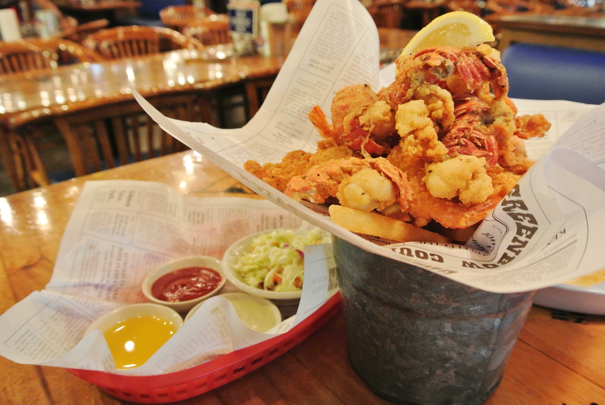 エビとロブスターのしっぽ部分、マヒマヒのフライ、ポテトが入ったバケツ!!!