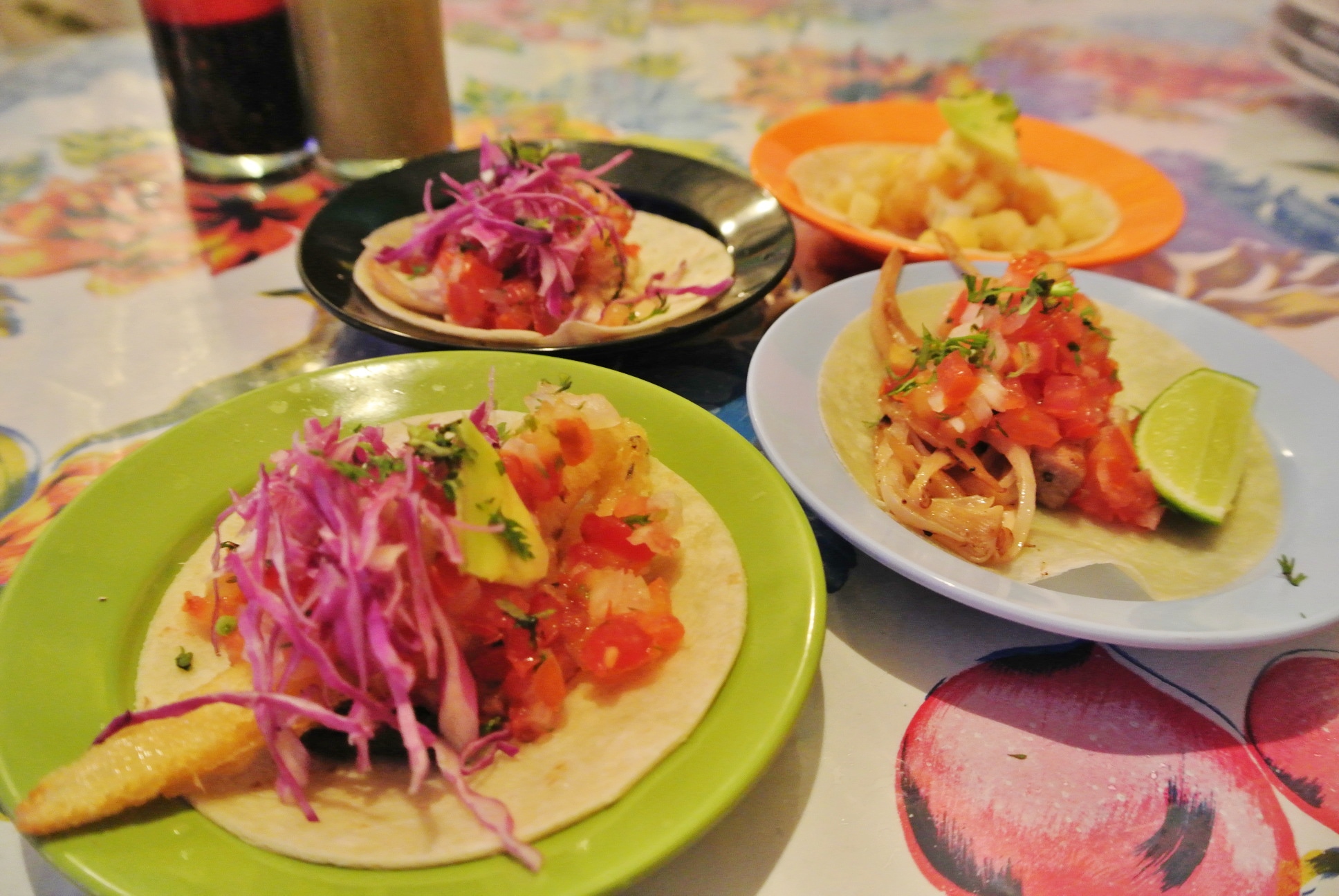 緑色の皿:野菜タコス 水色の皿:グリルフィッシュ 黒色の皿:グリルチキン オレンジの皿:えび天ぷら