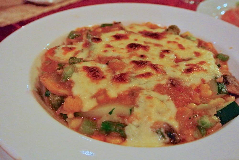 こちらギリシャ料理だそうで 茄子のスライスと様々な野菜の上にチーズが乗ってる一品