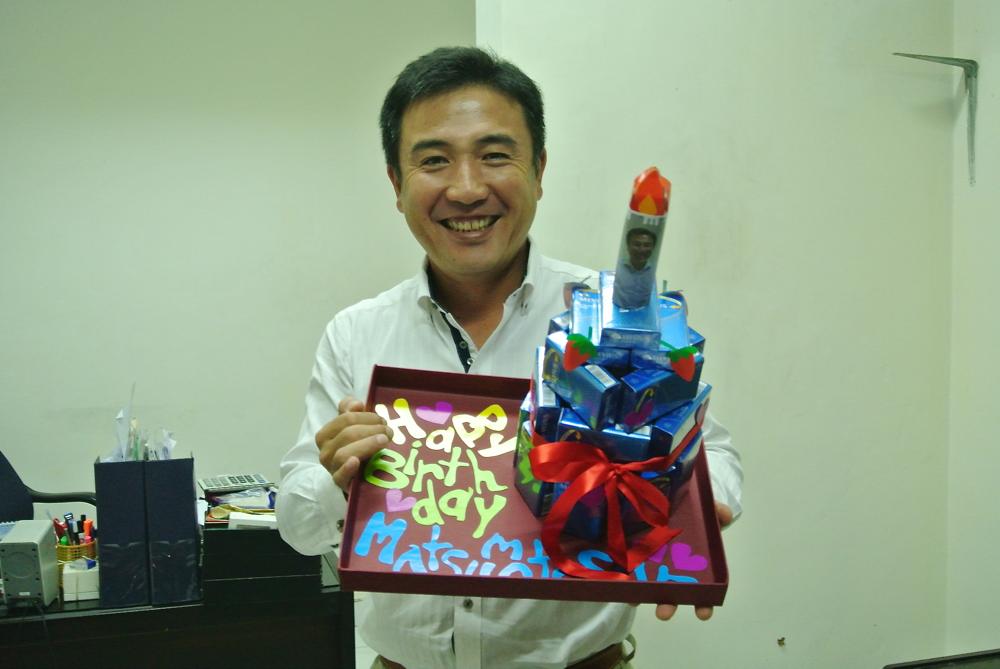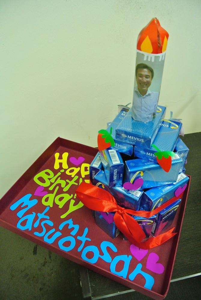 今回はお手製タバコケーキ!!!! ロウソクはご本人。