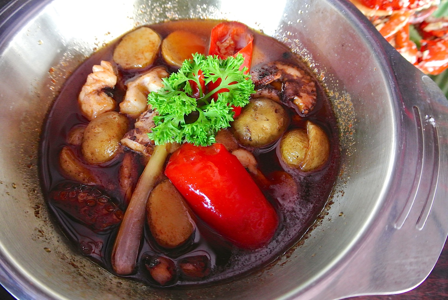 ぐつぐつ煮立ったオリーブオイルのお鍋に入ったタコのアヒージョ